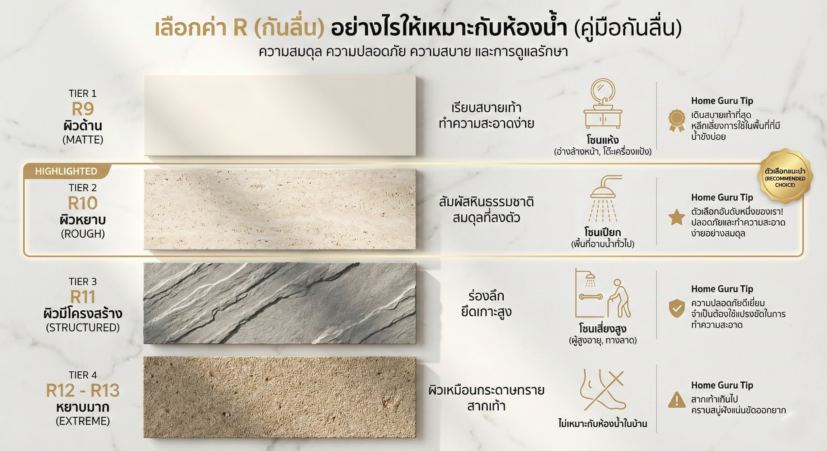 อย่าเลือกค่า R สูงเกินไป (เช่น R12-R13) มาปูในบ้าน! เพราะผิวมันจะหยาบมากจนเหมือน "กระดาษทราย" ทำให้คราบสบู่และคราบไคลเข้าไปฝังแน่น ขัดออกยากมาก