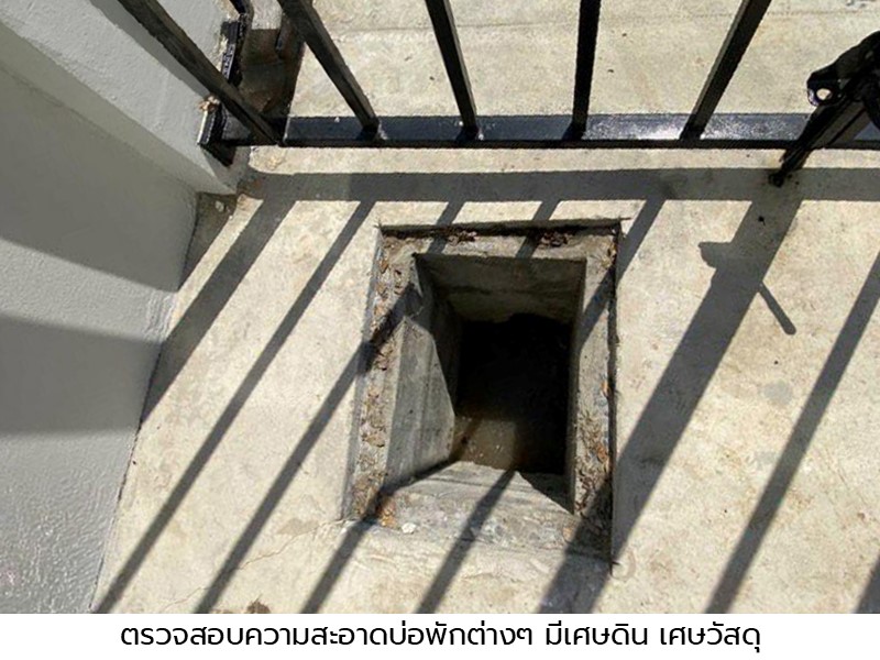 - ตรวจสอบการระบายน้ำ การอุดตันของบ่อพักน้ำทิ้ง บ่อดักขยะ บ่อดักไขมันและบ่อบำบัดน้ำเสีย