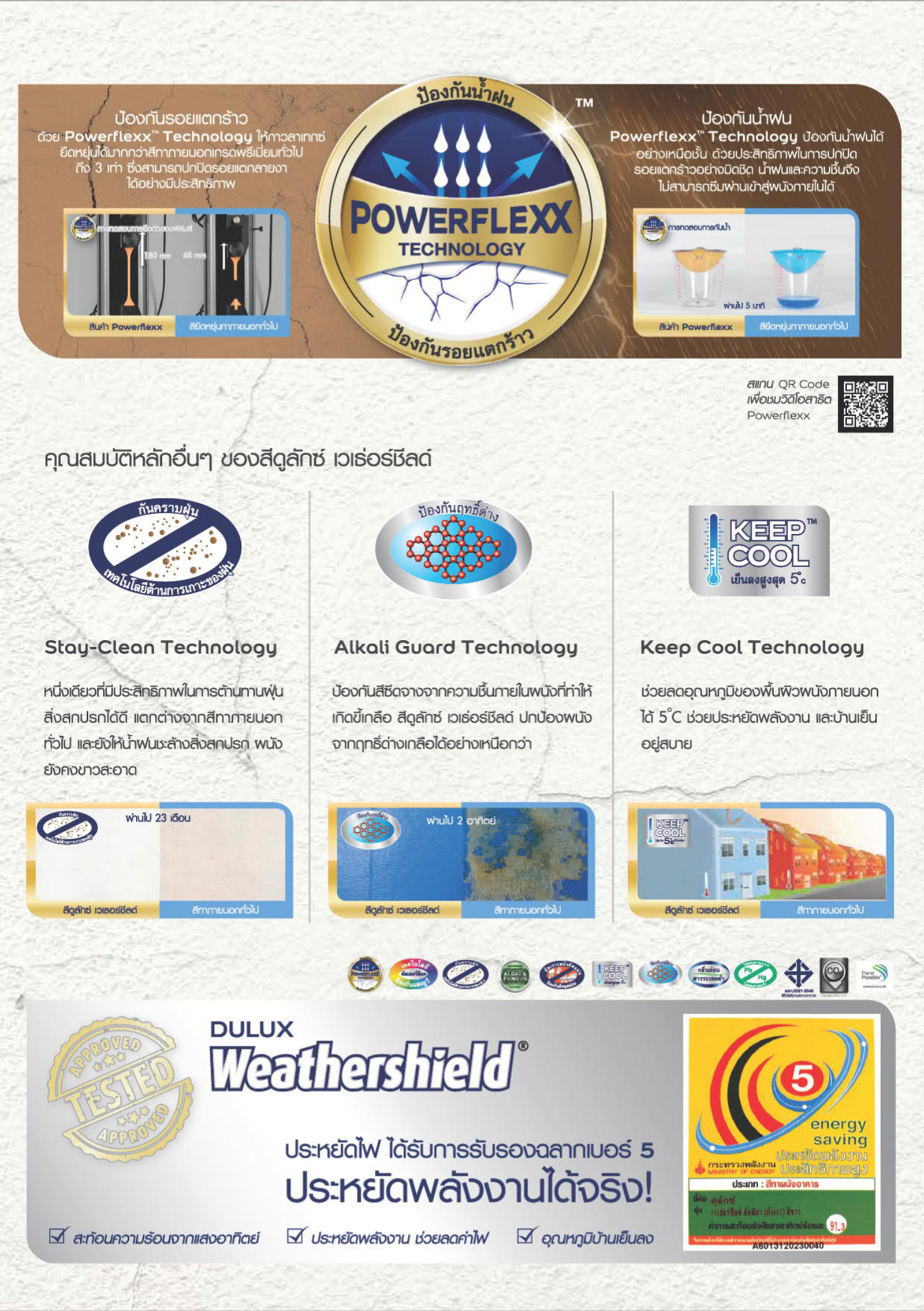 WATER-BASED EXTERIOR PAINT DULUX WEATHERSHIELD POWERFLEXX BASE D WHITE SHEEN 9LPowerflexx water-based acrylic paint from DULUX WEATHERSHEILD provides full coverage on the outdoor wall. By integrating the Powerflexx technology into the paint, it results in 3 times better flexibility of the paint film. It also features the Keep Cool technology to help reflect heat and protect against UV radiation, allowing room temperature to be lowered and cooler.