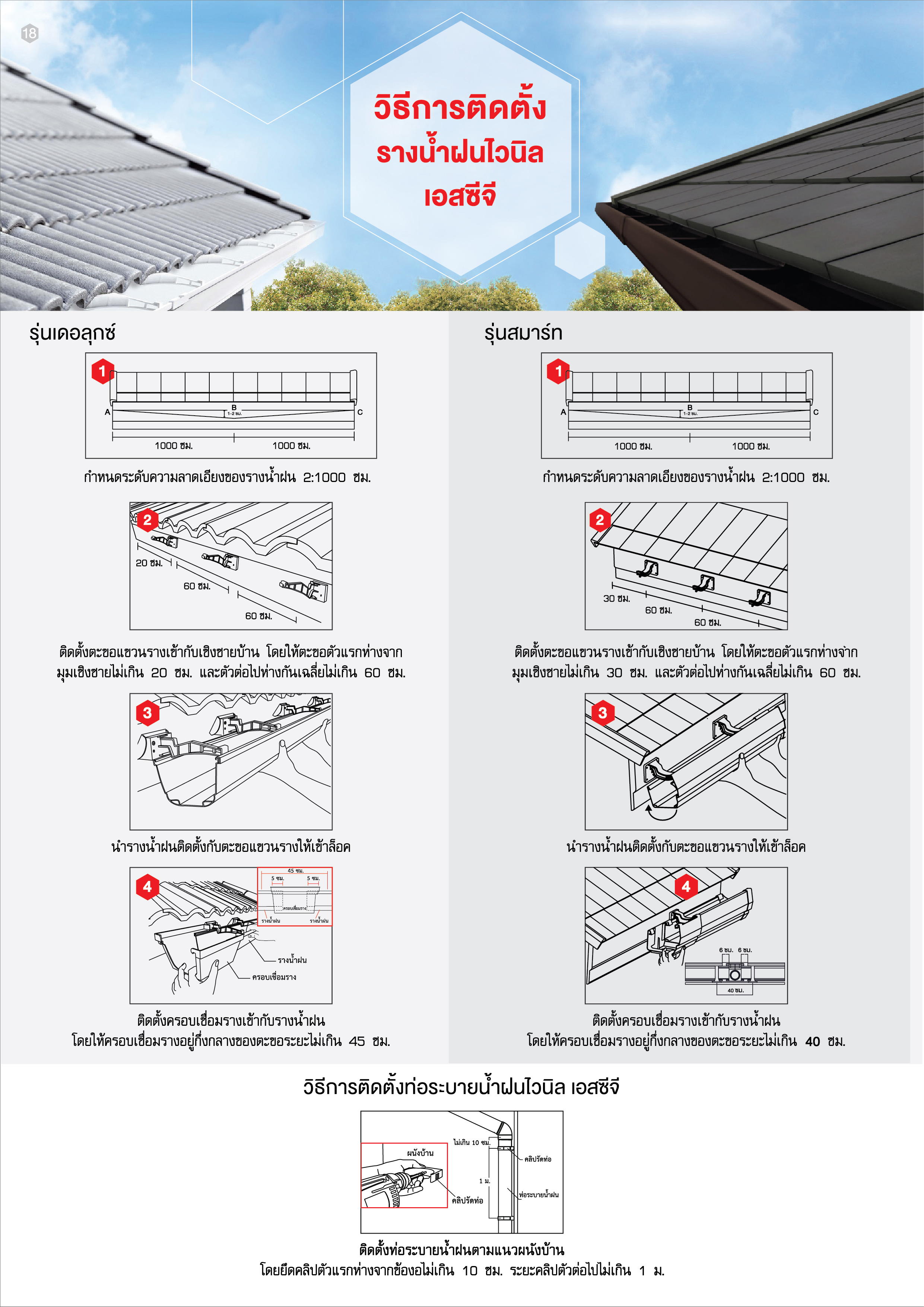 ใช้ระบายน้ำฝน และช่วยป้องกันน้ำฝนไหลย้อนกลับเข้าเชิงชายและฝ้า ควรติดตั้งโดยช่างผู้ชำนาญ และควรวัดระยะให้แน่ชัด ก่อนการติดตั้ง