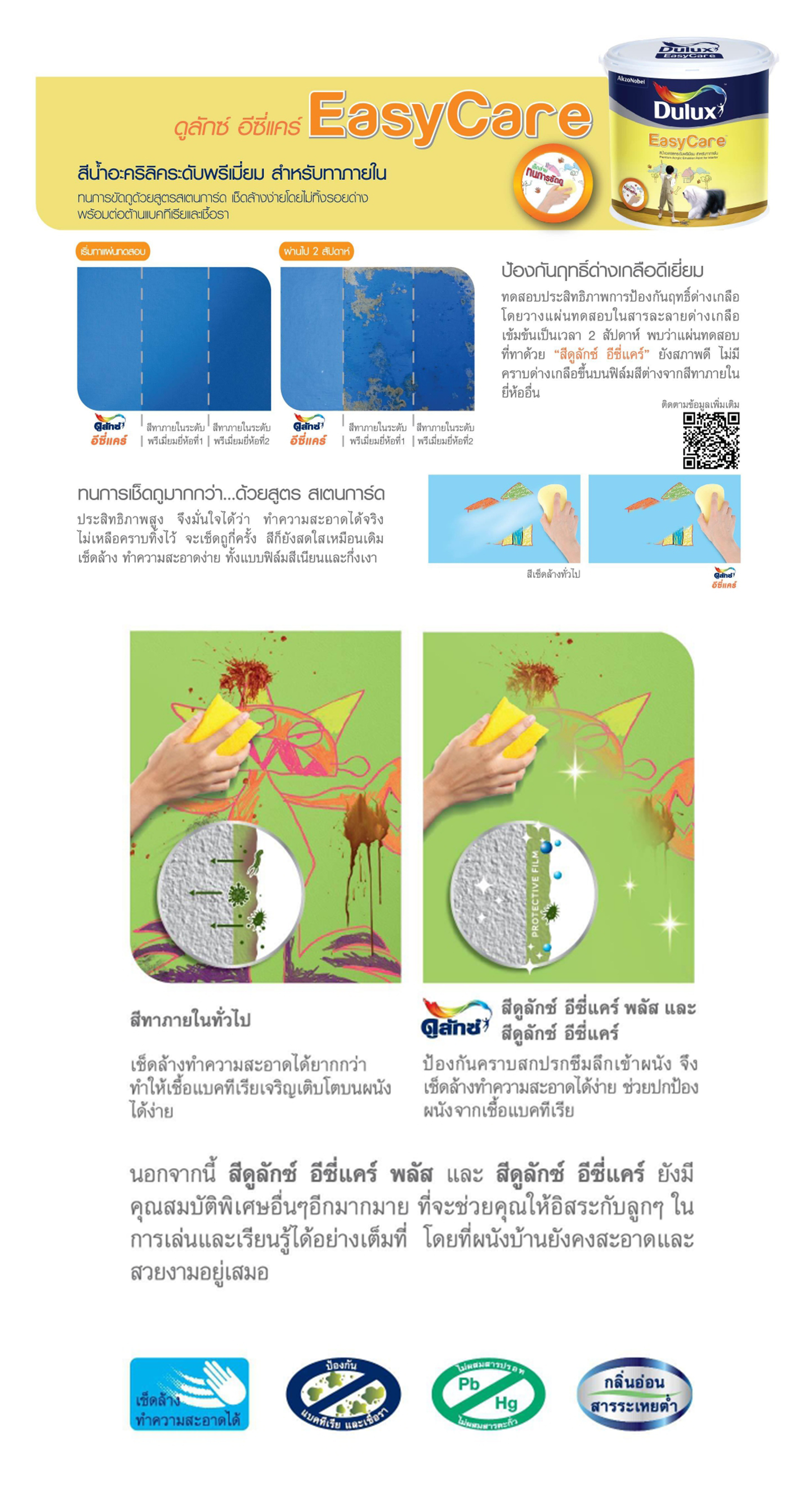 สีน้ำทาภายใน DULUX EASYCARE สีขาว ด้าน 5 แกลลอนดูลักซ์ อีซี่แคร์ สีน้ำทาภายในระดับพรีเมี่ยม ผลิตจากกาวอะครีลิคคุณภาพสูงด้วยสูตร “สเตนการ์ด” ประสิทธิภาพสูงในการเคลือบพื้นผิว เช็ดทำความสะอาดง่าย ทนต่อการเช็ดถูได้มากกว่าสีเช็ดล้างทั่วไป ให้คุณเช็ดคราบสกปรกในชีวิตประจำวันออกได้ง่ายโดยไม่ทิ้งรอยด่าง แม้แต่รอยคราบฝังลึกก็ขัดถูได้ พร้อมการป้องกันเชื้อราและแบคทีเรีย กลิ่นอ่อน และมีปริมาณสารอินทรีย์ระเหยต่ำ (Low-VOCs)