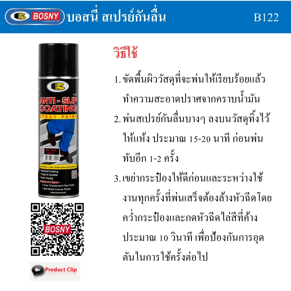 สเปรย์กันลื่น BOSNY A02 600 มล. สีดำหมดกังวลเรื่องอุบัติเหตุจากการลื่นล้มในบ้าน ด้วยสเปรย์กันลื่น จาก BOSNY ตัวช่วยด่วนที่เปลี่ยนพื้นผิวอันตรายให้ปลอดภัยขึ้นทันทีเพียงการพ่นเดียว กับเทคโนโลยีเม็ด Granules ที่ช่วยเพิ่มแรงเสียดทานอย่างเป็นธรรมชาติ ให้สัมผัสที่มั่นคงไม่ว่าจะบนบันได พื้นห้องน้ำ หรือรอบสระว่ายน้ำ แห้งไวใน 10 นาที ตอบโจทย์ความปลอดภัยที่ทำเองได้ง่ายๆ