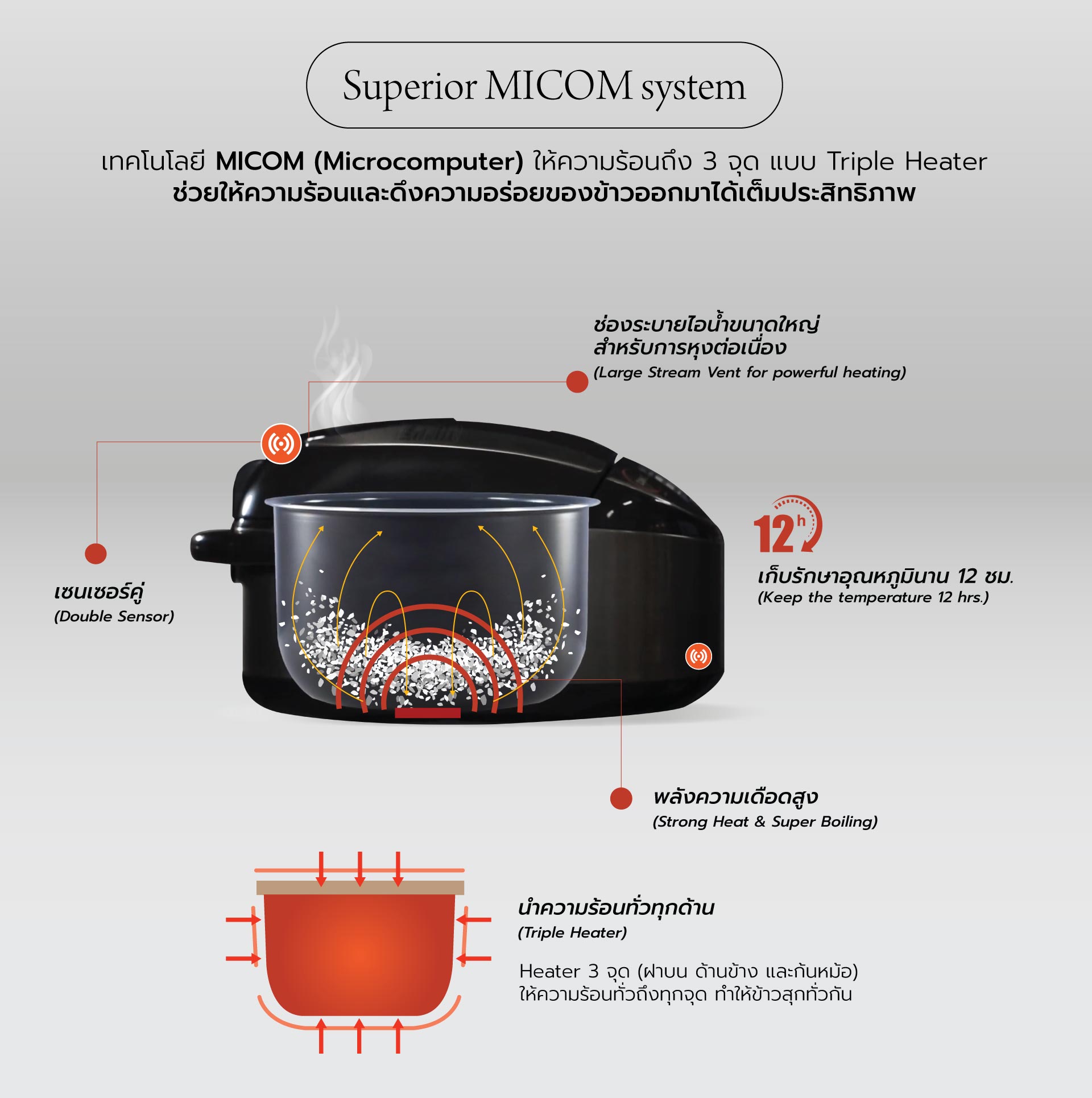ระบบเซนเซอร์คู่ เพื่อรักษาอุณหภูมิความร้อนบริเวณกลางหม้อ ช่วยให้ข้าวสุกเท่ากัน และสัมผัสนุ่มอร่อย วัสดุนำความร้อน 3 จุด ให้ความร้อนทั่วถึง มีช่องระบายความร้อนขนาดใหญ่ สะดวกด้วยฟังก์ชันหุงด่วน ฟังก์ชันนึ่งอาหาร และฟังก์ชันตุ๋น ฟังก์ชัน Reheat อุ่นข้าวให้พร้อมทานภายใน 10 นาที สามารถหุงข้าวได้หลากหลายประเภท