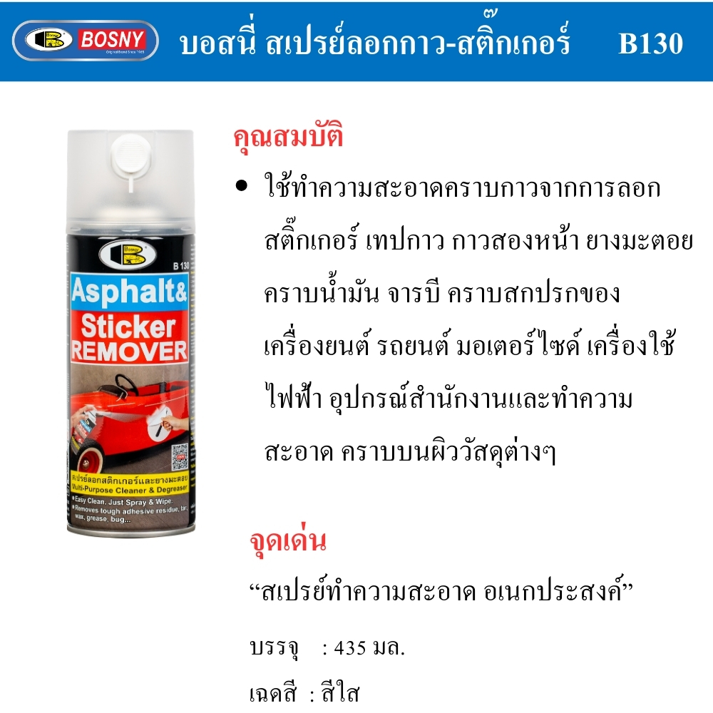 สเปรย์ลบคราบกาวและยางมะตอย BOSNY 435 มล.เปลี่ยนการขจัดคราบสกปรกให้กลายเป็นเรื่องง่าย ด้วยสเปรย์ล้างคราบกาวและยางมะตอย จากแบรนด์ BOSNY เนื้อน้ำยามีความใสและไม่มีสีทำหน้าที่ช่วยลบคราบบนผิววัสดุต่าง ๆ ได้โดยไม่ทำลายสีของรถยนต์ สูตรเข้มข้นทำหน้าที่ช่วยให้คราบกาวที่ฝังแน่นหลุดลอกออกได้เพียงแค่ฉีดแล้วเช็ดออกโดยไม่ต้องออกแรงขัด ช่วยให้งานดูแลบ้านและรถดูสะอาดตาอยู่เสมอ เพิ่มประสิทธิภาพในการขจัดคราบเหนียวสะสมให้หมดไปอย่างรวดเร็วและง่ายดาย