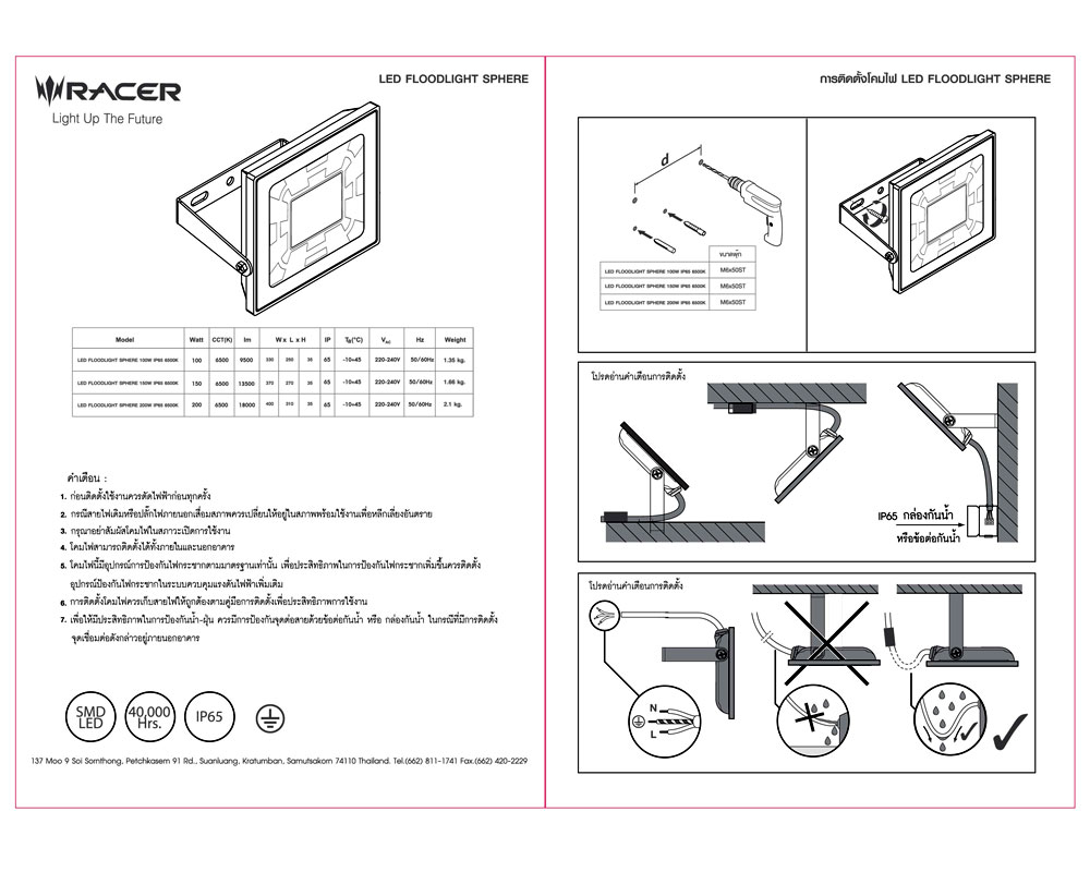 สปอตไลท์ภายนอก LED RACER SPHERE 150 วัตต์ DAYLIGHTเพิ่มแสงสว่างให้ครอบคลุมพื้นที่การใช้งานของคุณได้มากกว่าที่เคยด้วย สปอตไลท์ภายนอก LED จากแบรนด์ RACER วัสดุโครงสร้างผลิตจากอะลูมิเนียมเกรดคุณภาพ แข็งแรงทนทาน ให้ประสิทธิภาพในการระบายความร้อนสูง ทั้งยังเสริมด้วยชิ้นส่วนกระจกชนิดหนาพิเศษ ทนทานต่อการกระแทก ติดตั้งได้ง่าย รองรับการใช้งานได้ทั้งภายในและภายนอกด้วยมาตรฐาน IP65 สามารถป้องกันฝุ่น และน้ำจากการฉีดที่ตัวอุปกรณ์ได้จากทุกทิศทาง ตอบโจทย์การใช้งานได้หลากหลายพื้นที่ ไม่ว่าจะเป็นบริเวณรอบที่พักอาศัย ร้านค้า ร้านอาหาร หรือโรงแรมทั่วไป หากคุณกำลังหาสปอตไลท์ภายนอก LED คุณภาพดีสักชิ้น สินค้าชิ้นนี้ถือว่าเป็นตัวเลือกหนึ่งที่สามารถเติมเต็มความสว่างให้กับพื้นที่ของคุณได้อย่างสมบูรณ์แบบ