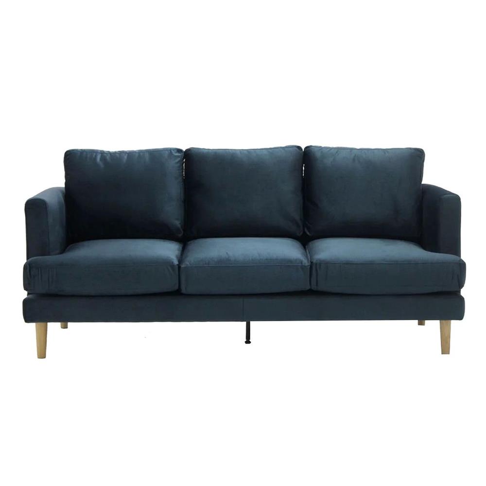 โครงขาผลิตจากไม้จริง มีความมั่นคง แข็งแรง สามารถรองรับน้ำหนักได้ถึง 360 กก. (แบบกระจายน้ำหนัก) เบาะและพนักพิงบุฟองน้ำหนานุ่ม มีความยืดหยุ่นสูง นั่งสบาย และสามารถคืนตัวได้ดี หุ้มด้วยผ้าที่มีคุณภาพนำเข้าจากต่างประเทศ ให้สัมผัสนุ่ม ไม่หดตัวง่าย ดีไซน์สไตล์โมเดิร์น เรียบง่าย ดูดี มาในโทนสีน้ำเงิน ช่วยเพิ่มความโดดเด่นให้กับบ้านได้เป็นอย่างดี สินค้าเฉพาะโซฟาเท่านั้น ไม่รวมของตกแต่งอื่น ๆ