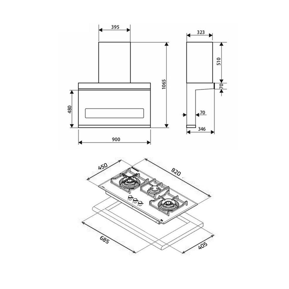 เตาแก๊ส 3 หัวเตา ขนาด 82 ซม. หัวเตาทองเหลืองทนความร้อนสูง ฐานกระจกนิรภัย เจียรขอบ ทนความร้อนสูง และทำความสะอาดง่าย หัวเตาซ้ายและขวาเปลวไฟ 3 ชั้น กำลังไฟข้างละ 5000 วัตต์ หัวเตาเล็ก กำลังไฟ 1700 วัตต์ ระบบจุดติดแก๊สอัตโนมัติ โดยใช้แบตเตอรี พร้อมระบบตัดแก๊สอัตโนมัติ ปุ่มลูกบิดหมุนใช้งานง่ายไม่สะดุด ปรับลดไฟได้อย่างใจต้องการ เครื่องดูดควันกระโจมแบบติดผนังรูปตัวแอลขนาด 90 ซม. กำลังดูดรวม 1200 ลบ.ม./ชม. ปรับแรงดูดได้ 3 ระดับ ตามความเหมาะสมในการใช้งาน แผงควบคุมการทำงานแบบระบบสัมผัส พร้อมจอแสดงผล LED ใช้งานง่าย ดีไซน์สวยหรูด้วยโครงสร้างสเตนเลสและกระจกนิรภัย