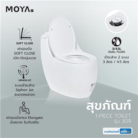 สุขภัณฑ์ 1 ชิ้น MOYA 309 3/4.5 ลิตร สีขาวสุขภัณฑ์แบบชิ้นเดียว จาก MOYA ผลิตมาจากวัสดุเซรามิกที่มีความแข็งแกร่ง ออกแบบให้นั่งสบายรับกับสรีระ เพื่อการใช้งานที่สบายมากที่สุด ฝารองนั่งแบบ Soft Close ปิดได้อย่างนุ่มนวล ช่วยลดแรงกระแทกและเสียงดังได้อย่างดี มาพร้อมระบบชำระล้าง 2 ระบบ ให้คุณเลือกใช้น้ำเพื่อประหยัดได้อย่างมีประสิทธิภาพ ทั้งยังทำความสะอาดได้หมดจด ดีไซน์สวยหรู ตกแต่งห้องน้ำได้ในสไตล์ที่เป็นคุณ