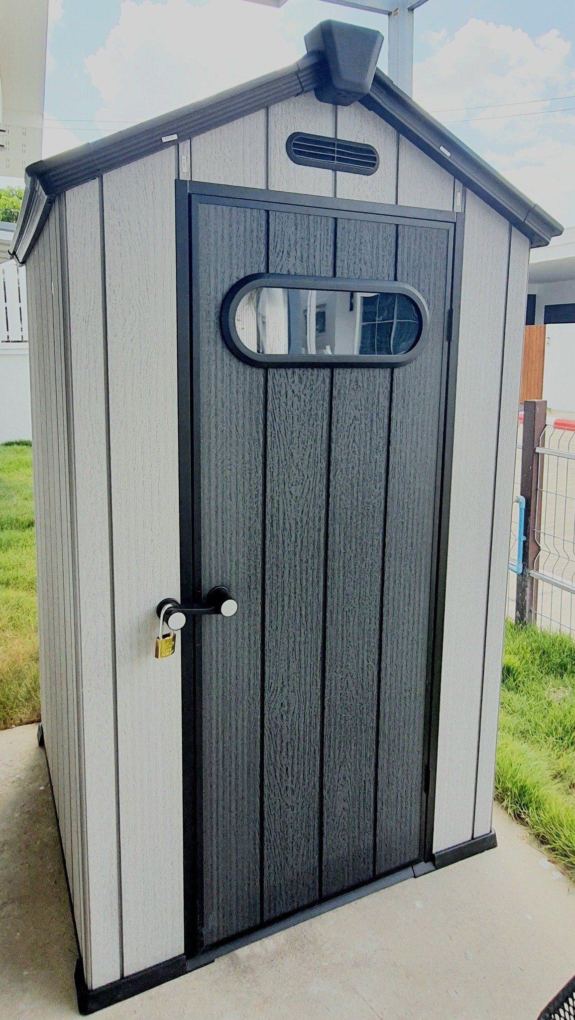 บ้านเก็บของกลางแจ้ง ใช้สำหรับจัดเก็บของให้เป็นระเบียบเรียบร้อย เพิ่มพื้นที่ใช้สอยยิ่งขึ้น ภายในตู้แบ่งพื้นที่เป็นสัดส่วน จัดเก็บเครื่องมือและอุปกรณ์เบ็ดเตล็ดต่างๆ อย่างเป็นระเบียบ มีพื้นที่วางของและแขวนของเยอะ สามารถรับน้ำหนักได้ถึง 250 กก. (แบบกระจายน้ำหนัก) ผลิตจากพลาสติกพอลิโพรไพลีนเนื้อเหนียว ตั้งวางและรองรับน้ำหนักสิ่งของได้เป็นอย่างดี มีส่วนผสมของสารที่ป้องกันรังสี UV ช่วยให้ทนทานต่อสภาพอากาศ และยืดอายุการใช้งาน โครงสร้างภายในมีการเสริมด้วยคานเหล็กชุบกัลวาไนซ์ เพื่อเพิ่มความแข็งแรง และทนทาน มีช่องรับแสงด้านบนที่ให้แสงลอดผ่าน ช่วยให้แสงธรรมชาติส่องเข้ามาได้ มองเห็นของง่าย เปิด-ปิดได้สะดวก ด้วยมือจับพลาสติกขึ้นรูป จับได้กระชับมือ มาพร้อมรูสำหรับคล้องกุญแจ ตั้งวางภายนอกบ้านได้มั่นคง ทนต่อสภาพอากาศ ต้านทานลมได้ระดับ 10 (100 กม./ชม.)
