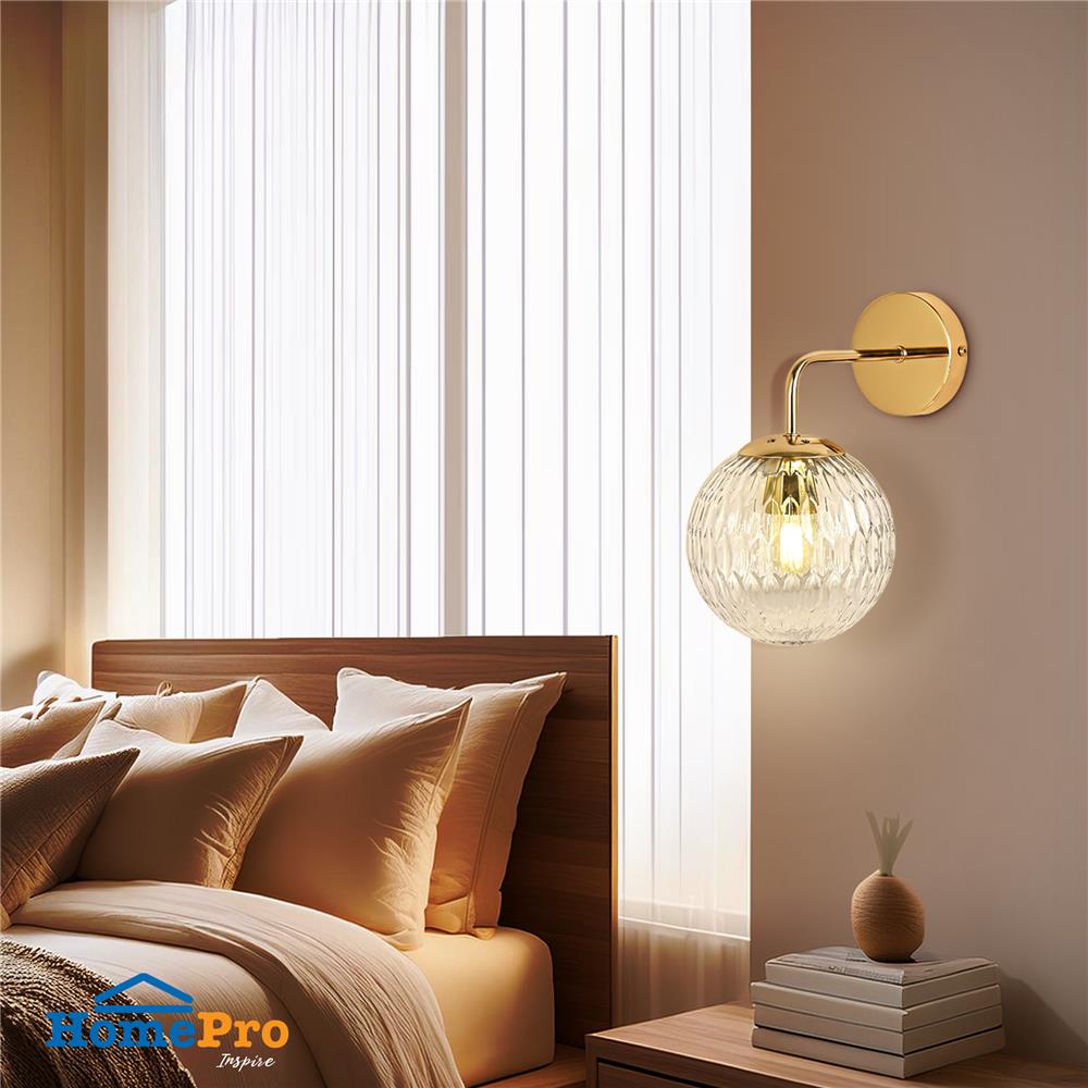 - ฐานโคมผลิตจากโลหะสีทองมีความเงางาม รองรับน้ำหนักและยึดติดผนังได้ดี