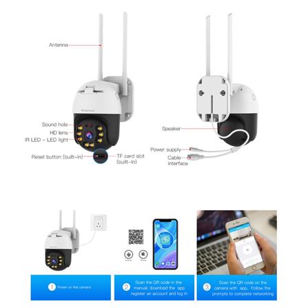 กล้องความละเอียด 3 ล้านพิกเซล ให้ภาพที่ละเอียด คมชัด และสมจริง มีเสา Wifi คู่ รับ Wifi ได้ไกลกว่าเดิม กล้องหมุนได้รอบตัว ซ้ายขวา 265 องศา ขึ้นลง 95 องศา มีไมโครโฟน และลำโพงในตัว ระบบเสียงสองทาง สามารถสื่อสารตอบโต้ได้ทันที มีไฟอินฟาเรด และ ไฟ LED กลางคืนมองเห็นเป็นภาพสี ภาพคมชัด มีไฟไซเรน เสียงไซเรน พร้อมทั้งแจ้งเตือนเข้าที่โทรศัพท์ได้ทันที เหมาะสำหรับติดตัั้งกลางแจ้ง กันน้ำได้ กันแดดได้ รองรับเมมโมรี่การ์ดสูงสุด 256 GB