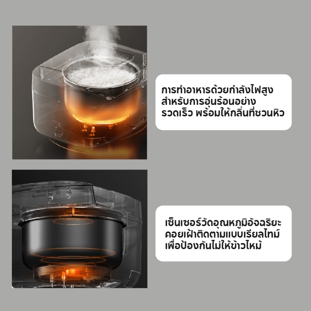 - เซนเซอร์วัดอุณหภูมิอัจฉริยะคอยเฝ้าติดตามแบบเรียลไทม์เพื่อป้องกันไม่ให้ข้าวไหม้