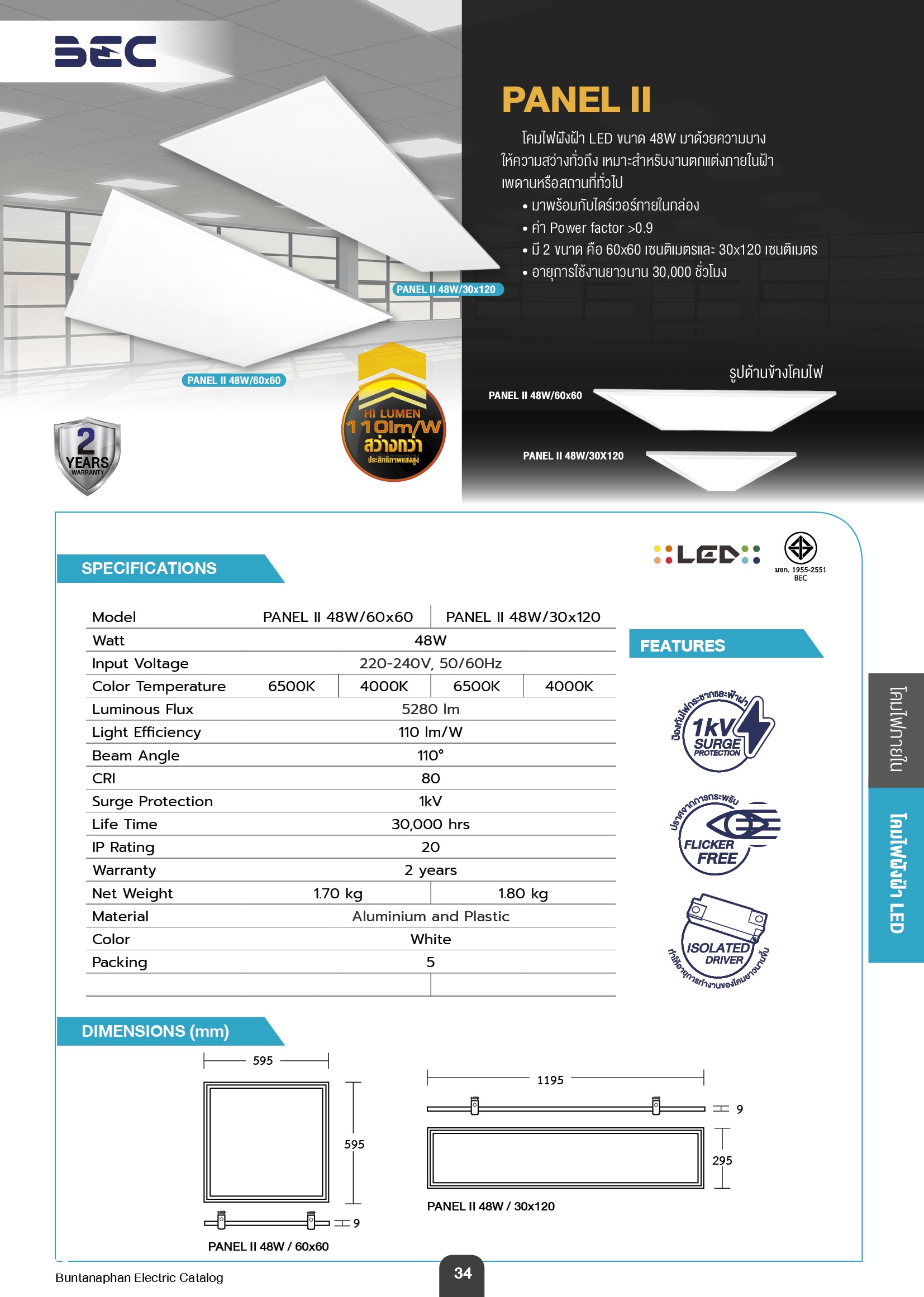 โคมฝังฝ้า LED BEC PANEL II 48 วัตต์ 60X60 ซม. DAYLIGHTให้ความสว่างอย่างเต็มประสิทธิภาพ ด้วยโคมฝังฝ้า LED จาก BEC ผลิตจากวัสดุที่มีประสิทธิภาพ สามารถระบายความร้อนได้ดี ให้แสงส่องสว่างกระจายในมุมกว้างอย่างทั่วถึงด้วยค่ามุมองศาแสง (Beam Angle) 110 องศา กำลังไฟขนาด 48 วัตต์ เหมาะอย่างยิ่งสำหรับติดตั้งภายในอาคาร สำนักงาน เพื่อให้นั่งทำงานได้อย่างสบายตา มองเห็นชัดเจน ช่วยให้บรรยากาศการทำงานเป็นไปได้ดียิ่งขึ้น ผ่านการผลิตที่ได้รับการรับรองคุณภาพมาตรฐาน มอก.1995-2551 ใช้งานได้อย่างมั่นใจในทุกวัน