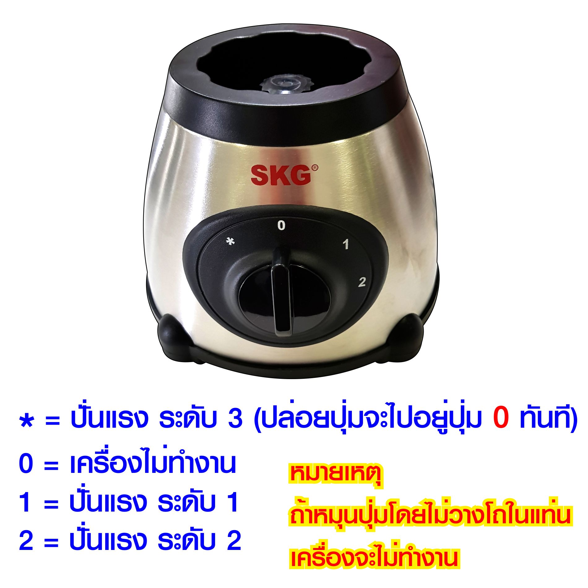 ห้ามนำอุปกรณ์ส่วนฐานจุ่มน้ำ หรือนำไปใช้บริเวณที่มีน้ำ ห้ามใช้งานหรือวางอุปกรณ์ใกล้ขอบโต๊ะ ห้ามใช้ของมีคมต่าง ๆ เช่น ฝอยโลหะ ทำความสะอาด อย่านำมือ หรืออุปกรณ์อื่น ๆ ยื่นลงในโถขณะเครื่องกำลังทำงาน ห้ามวางสินค้าใกล้มือเด็ก |