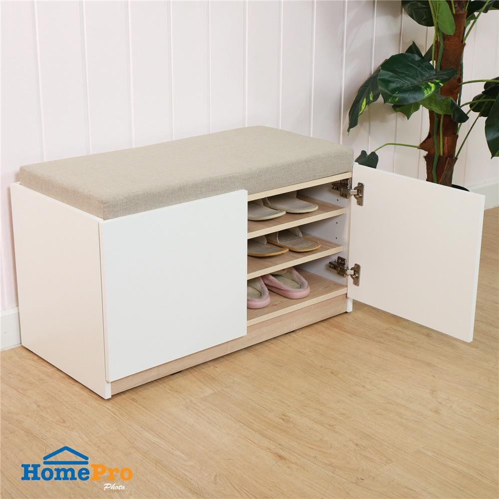 ตู้รองเท้าขนาด 80 ซม. ช่วยจัดเก็บรองเท้าให้เป็นระเบียบ สามารถจัดเก็บได้ 12-16 คู่ (คละไซซ์) มาพร้อมเบาะนั่งบริเวณด้านบน เบาะหนานุ่มหุ้มด้วยผ้าคุณภาพสูง ช่วยให้นั่งใส่รองเท้าได้สะดวก บานเปิด 2 บาน ภายในมีชั้นวาง สามารถปรับระดับชั้นได้ตามการใช้งาน หน้าบานระบบ Soft Close ช่วยชะลอการกระแทก เปิด-ปิดได้นุ่มนวล ไร้เสียงรบกวน โครงสร้างทำจากไม้ปาร์ติเกิลบอร์ด ปิดผิวด้วยวัสดุฟอยล์และเมลามีน ให้ผิวสัมผัสดูเรียบเนียนสวย