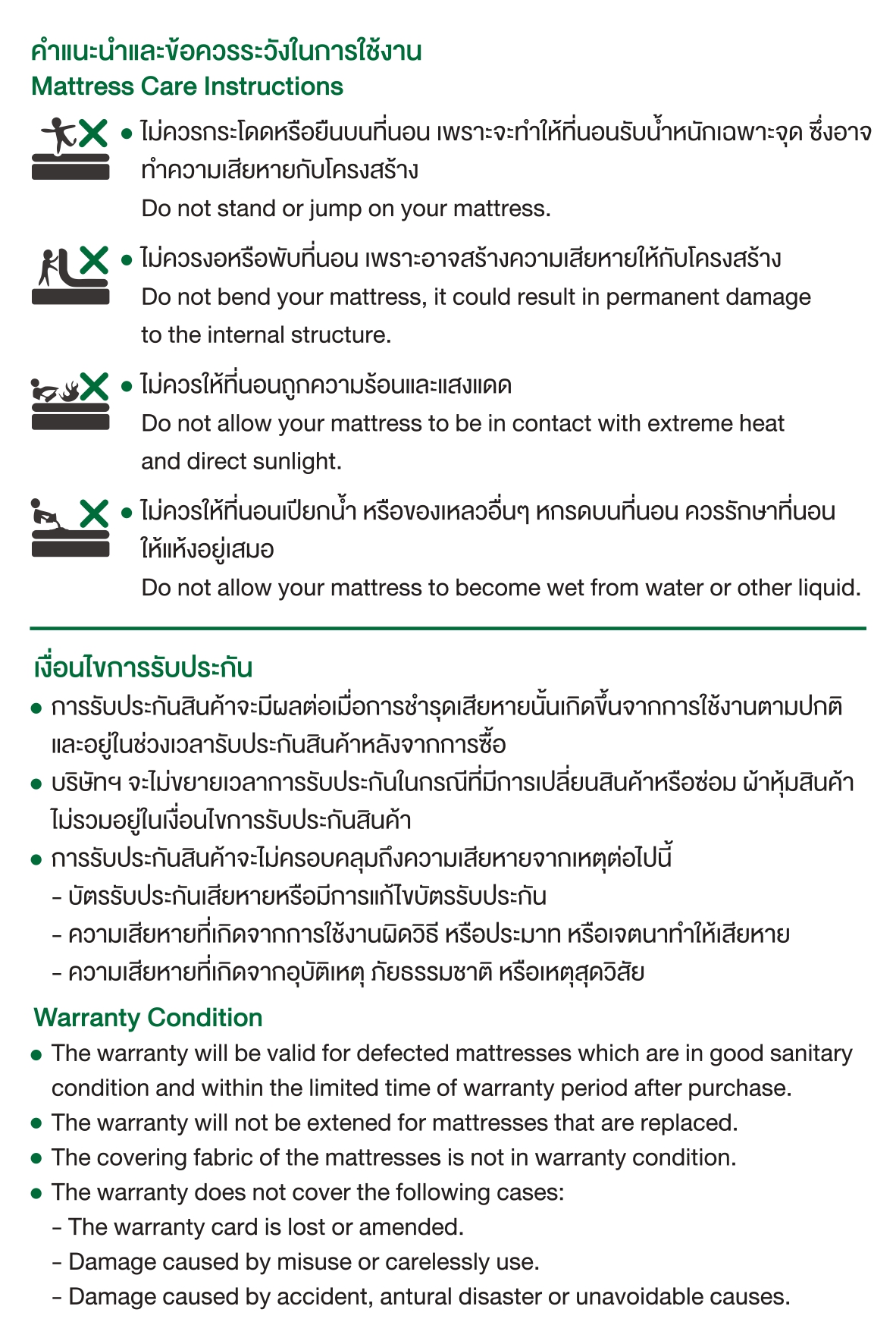หลีกเลี่ยงการสัมผัสของเหลวและความชื้น หลีกเลี่ยงของมีคมและของปลายแหลม หลีกเลี่ยงการใช้สารเคมีหรือสารฟอกขาวในการทำความสะอาด ไม่ควรกระโดดหรือกระแทกบนที่นอนอย่างรุนแรง |