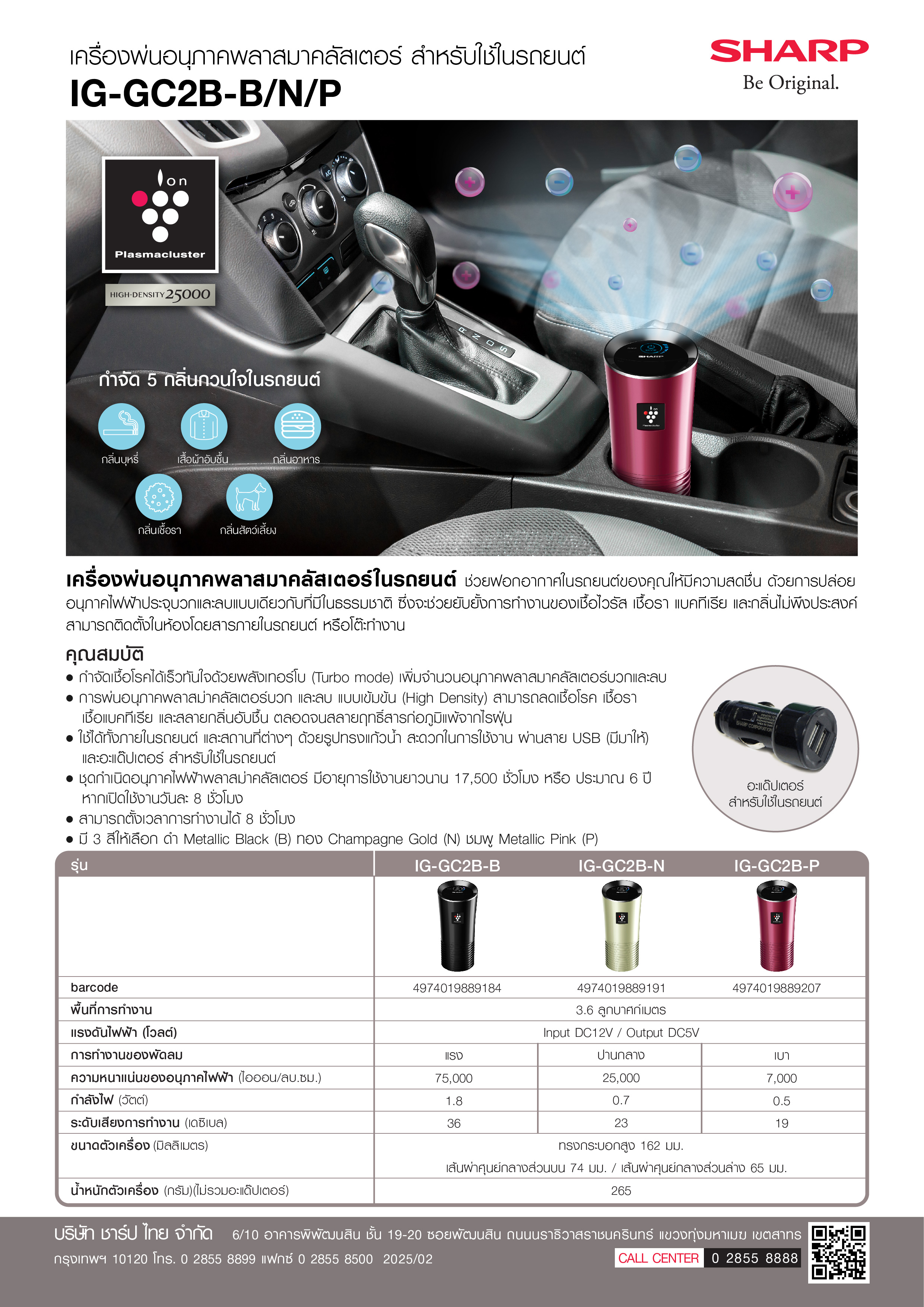 เครื่องฟอกอากาศในรถยนต์ SHARP IG-GC2B-B 3.6 ตร.ม. สีดำเครื่องฟอกอากาศในรถยนต์ จาก SHARP ช่วยฟอกอากาศในรถยนต์ของคุณให้มีความสดชื่น ด้วยการปล่อยอนุภาคไฟฟ้าประจุบวกและลบแบบเดียวกับที่มีในธรรมชาติ ซึ่งจะช่วยยับยั้งการทำงานของเชื้อไวรัส เชื้อรา แบคทีเรีย และกลิ่นไม่พึงประสงค์ สามารถติดตั้งในห้องโดยสารภายในรถยนต์ หรือโต๊ะทำงาน