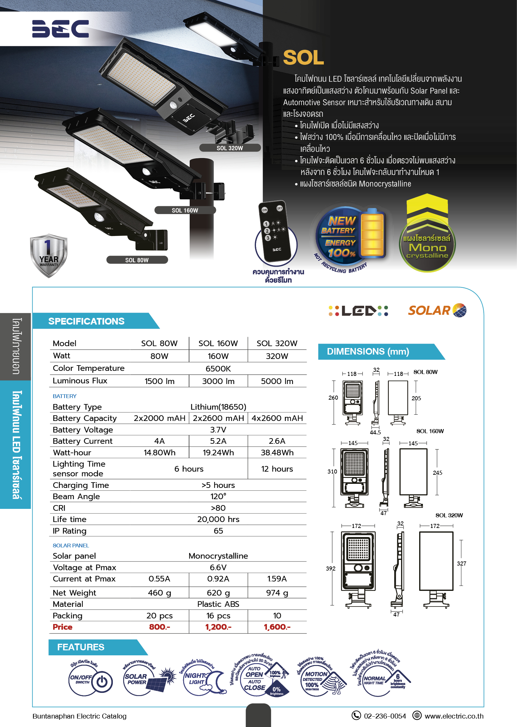 แผงโซลาร์เซลล์ชนิด Monocrystalline มีประสิทธิภาพในการใช้งานทนทานสภาพอากาศได้ดี กำลังไฟ 80 วัตต์ ค่าความสว่าง 1,500 ลูเมน สามารถกระจายแสงไฟได้เป็นกว้างทั่วทั้งบริเวณ ให้โทนแสง DAYLIGHT แสงสีขาวธรรมชาติ เหมือนแสงสว่างตอนกลางวัน มองเห็นได้ชัดเจน มุมกระจายแสง 120 องศา ส่องสว่างพื้นที่บริเวณกว้าง เช่น ถนน ลานจอดรถหรือพื้นที่รอบบ้าน ระบบ Light Sensor ตรวจจับแสงสว่างและเปิด-ปิด ได้อัตโนมัติตามแสงสว่างของดวงอาทิตย์ ไฟสว่าง 100% เมื่อมีการเคลื่อนไหวและปิดหลังจากผ่านไป 20 วินาที เมื่อไม่มีการเคลื่อนไหว ไฟติดเป็นเวลา 6 ชม. เมื่อตรวจไม่พบแสงสว่างหลังจาก 6 ชม. ไฟจะกลับมาทำงานโหมดแรก มาตรฐาน IP65 กันฝุ่น และกันน้ำได้อย่างมีประสิทธิภาพ เหมาะสำหรับใช้งานภายนอกอาคาร ตัวโคมทำจากพลาสติก ABS คุณภาพดี มีความแข็งแรง สามารถทนทานต่อสภาพอากาศได้ดี ใช้แบตเตอรี่ Lithium (18650) 2x2000 mAH 3.7 โวลต์ ให้ความสว่างยาวนาน 6-12 ชั่วโมง