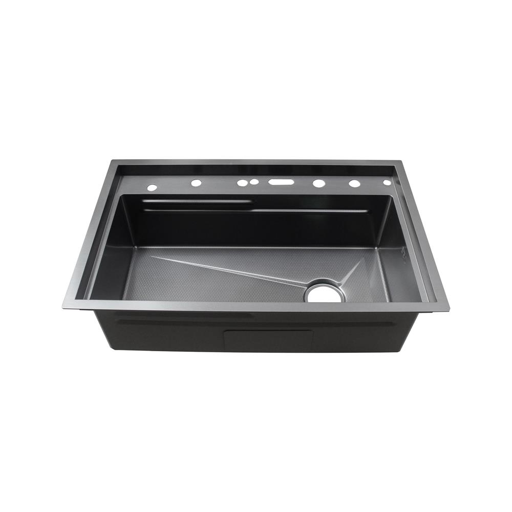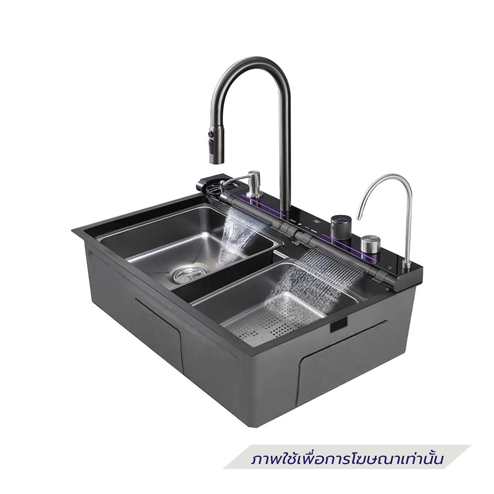 ผลิตจากสเตนเลส 304 หลุมอ่างลึก 22 ซม., ขอบหนา 3 มม., ตัวอ่างหนา 0.8 มม. (ความหนายังไม่รวมเคลือบนาโน) อ่างซิงค์เคลือบผิว 4 ชั้น ด้วยนาโนเทคโนโลยี ช่วยลดคราบน้ำและป้องกันรอยขีดข่วนได้เป็นอย่างดี ข้างใต้อ่างซิงค์เคลือบกันชื้น ป้องกันเชื้อรา และมีแผ่นซับเสียง ลดเสียงรบกวนขณะใช้งาน มาพร้อมฟังก์ชันปุ่มปรับเปลี่ยนสายน้ำ 5 แบบ รองรับการใช้งานทั้งน้ำร้อนและน้ำอุณหภูมิปกติ คอก๊อกน้ำหลักสามารถลากดึงได้รอบทิศทาง พร้อมปรับเปลี่ยนสายน้ำได้ 3 รูปแบบ สะดวกในการชำระล้าง ก๊อกม่านน้ำตก 2 ฝั่ง สามารถปรับระดับขึ้นลงได้ มอบสายน้ำที่นุ่มนวล ถนอมผิวผักผลไม้ได้เป็นอย่างดี มีก๊อกสำหรับเครื่องกรองน้ำ มาพร้อมที่กดน้ำยาล้างจานหัวสเตนเลส และที่กดล้างแก้ว ระบบระบายน้ำแบบสุญญากาศ สามารถระบายน้ำทิ้งได้รวดเร็ว ภายในชุดประกอบด้วย ถาดสแตนเลส 2 ใบ, เขียงสเตนเลส 304(food grade), สะดืออ่าง, สายน้ำดี และท่อน้ำทิ้ง ระยะเจาะเคาน์เตอร์ 78.5 x 44.5 ซม.