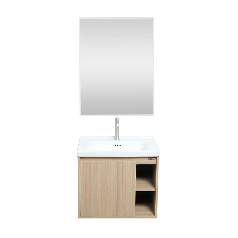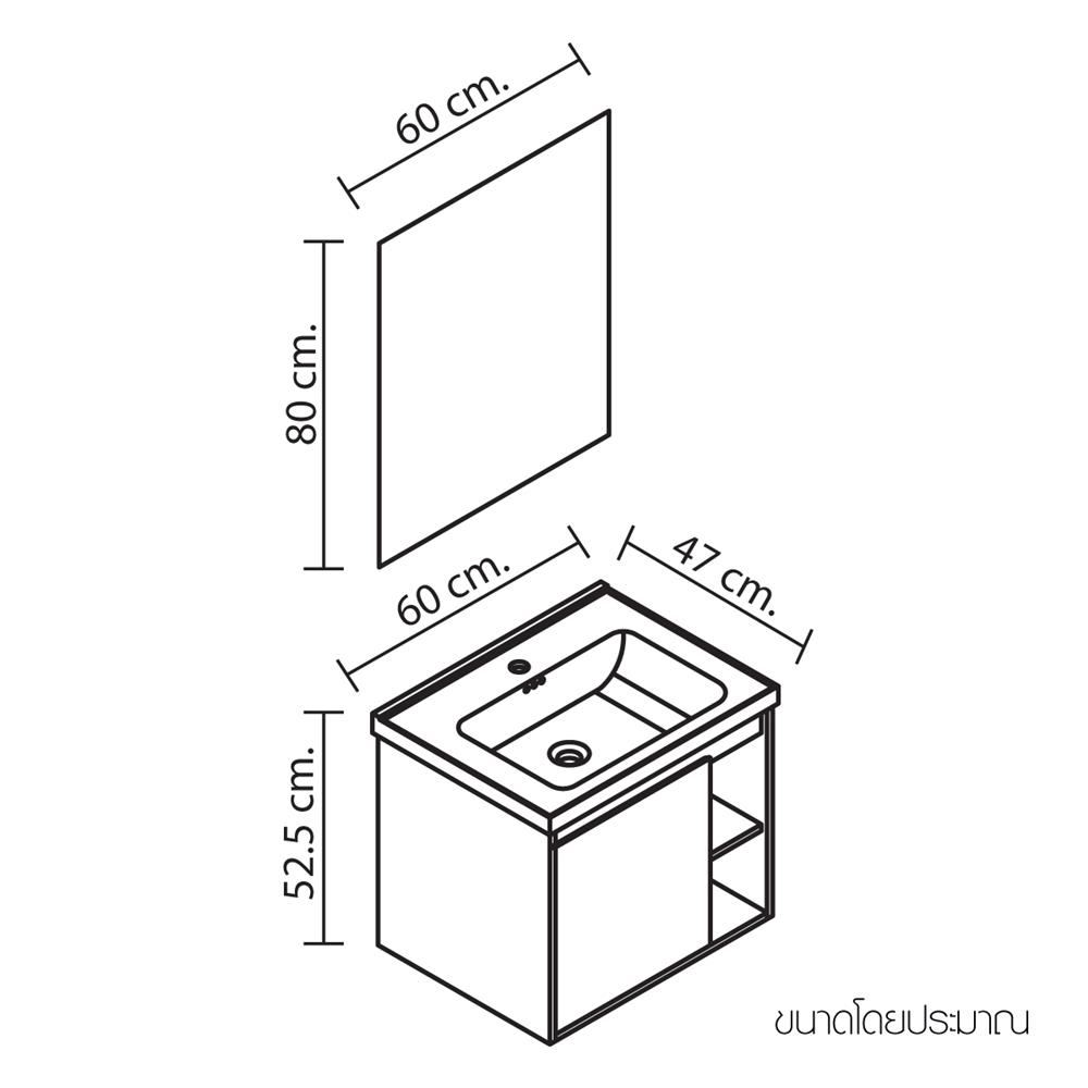อ่างล้างหน้าผลิตจากเซรามิก คุณภาพดี แข็งแรง ทนต่อการใช้งาน และง่ายต่อการดูแลทำความสะอาด มาพร้อมตู้เคาน์เตอร์ผลิตจากแผ่น PVC ปิดผิวด้วยเมลามีนลายไม้ธรรมชาติ ผิวสัมผัสเรียบเนียน รองรับน้ำหนักของอ่างล้างหน้าได้เป็นอย่างดี ดีไซน์หน้าบานเปิด 1 บาน พร้อมช่องโล่ง 2 ช่อง สำหรับจัดเก็บสิ่งของต่างๆ ให้เป็นระเบียบ หยิบใช้งานง่าย หน้าบานมีร่องมือจับ เปิด-ปิดได้นุ่มนวล ด้วยระบบ Soft-Close ช่วยลดแรงกระแทกและถนอมหน้าบาน มีกระจกเคลือบผิวด้วยซิลเวอร์โค้ทติ้ง ผิวเรียบ เงาสะท้อนให้ภาพเหมือนจริง ไม่หลอกตา เหมาะสำหรับติดตั้งบนผนัง ช่วยตกแต่งและเพิ่มบรรยากาศที่ดีภายในห้องน้ำ