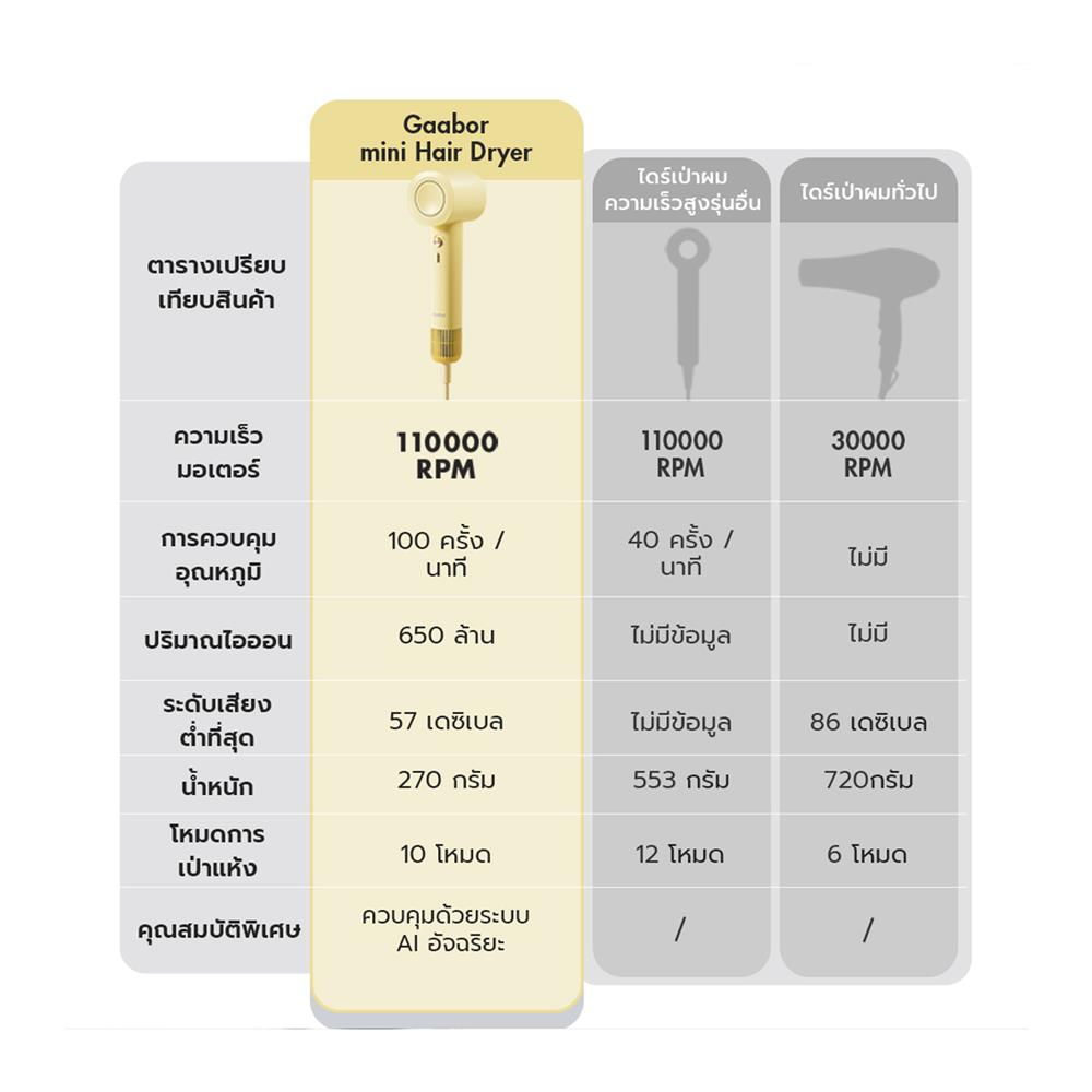 ไดร์เป่าผม GAABOR HD-MINI03A สีเหลืองให้การจัดแต่งทรงผมคุณรวดเร็วยิ่งขึ้น ด้วยไดร์เป่าผม GAABOR ที่พร้อมมอบผมสวยสุขภาพดีให้กับคุณ ให้ผมที่แห้งไว นุ่มสลวย และจัดทรงง่าย ไม่ว่าจะรีบแค่ไหนก็เอาอยู่ ด้วยการออกแบบที่ให้ความร้อนคงที่ในอุณหภูมิที่เหมาะสมกับเส้นผม ทำให้ผมคุณไม่แห้งเสีย ด้วยพลังลมที่ทรงประสิทธิภาพ ช่วยให้ผมแห้งเร็วขึ้นอย่างเห็นได้ชัด พร้อมเผยผมที่สวยเงางามเป็นธรรมชาติ มั่นใจได้ในทุกทรง