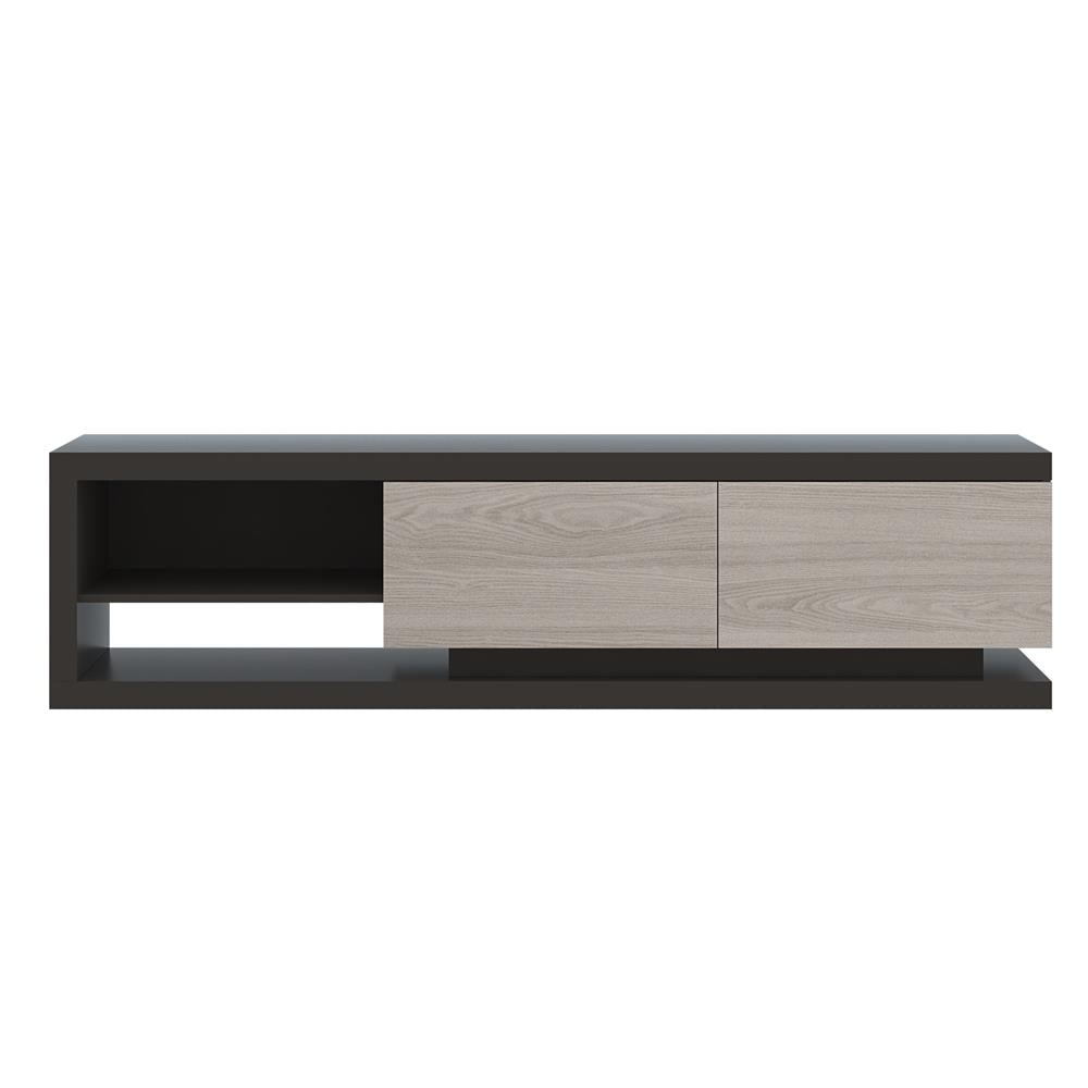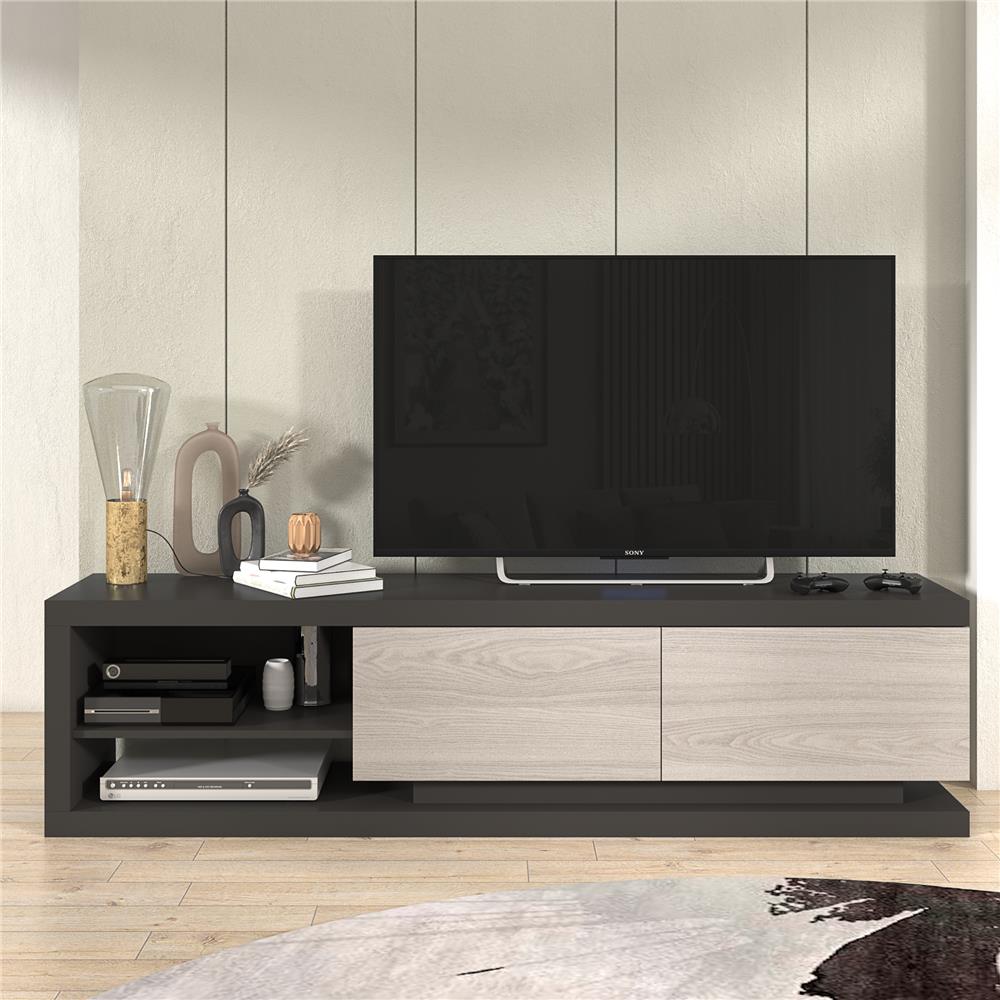 ตู้วางทีวี โทนสีเทาตัดหน้าบานสีไม้อ่อนแบบทูโทน สามารถวางทีวีได้ถึง 75 นิ้ว (แบบกระจายน้ำหนัก) โครงสร้างทำจากเนื้อไม้ปาร์ติเกิลบอร์ด ปิดผิวด้วยวัสดุกระดาษ PU ช่วยเพิ่มความสวยงามให้กับพื้นผิว โครงสร้างถูกออกแบบมาให้รองรับน้ำหนักอุปกรณ์และสิ่งของได้มากถึง 50 กก. (แบบกระจายน้ำหนัก) มีช่องเก็บของบานเปิด สามารถจัดเก็บสิ่งของได้อย่างมิดชิด ช่วยให้พื้นที่เป็นระเบียบเรียบร้อย มีชั้นวางเปิดโล่ง เหมาะสำหรับวางอุปกรณ์กล่องรับสัญญาณ เครื่องเล่นเกม ซาวด์บาร์ หรือของตกแต่ง