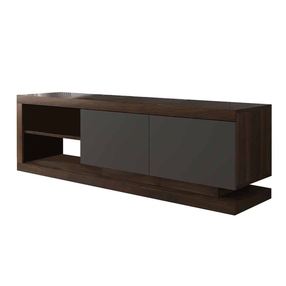 ตู้วางทีวี โทนสีไม้เข้มตัดหน้าบานสีเทาแบบทูโทน สามารถวางทีวีได้ถึง 65 นิ้ว (แบบกระจายน้ำหนัก) โครงสร้างทำจากเนื้อไม้ปาร์ติเกิลบอร์ด ปิดผิวด้วยวัสดุกระดาษ PU ช่วยเพิ่มความสวยงามให้กับพื้นผิว โครงสร้างถูกออกแบบมาให้รองรับน้ำหนักอุปกรณ์และสิ่งของได้มากถึง 50 กก. (แบบกระจายน้ำหนัก) มีช่องเก็บของบานเปิด สามารถจัดเก็บสิ่งของได้อย่างมิดชิด ช่วยให้พื้นที่เป็นระเบียบเรียบร้อย มีชั้นวางเปิดโล่ง เหมาะสำหรับวางอุปกรณ์กล่องรับสัญญาณ เครื่องเล่นเกม ซาวด์บาร์ หรือของตกแต่ง