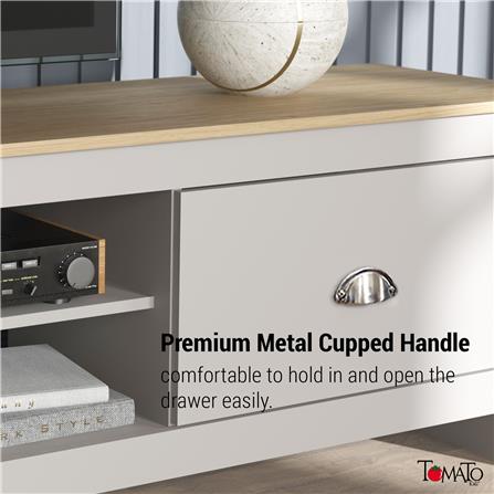 ท็อปชั้นวางด้านบนสีไม้ธรรมชาติอ่อน กว้าง 180 ซม. ตั้งวางทีวีได้สูงสุด 75 นิ้ว (แบบกระจายน้ำหนัก) โครงสร้างทำจากเนื้อไม้ปาร์ติเกิลบอร์ด ปิดผิวด้วยวัสดุกระดาษ PU ช่วยเพิ่มความสวยงามให้กับพื้นผิว โครงสร้างถูกออกแบบมาให้รองรับน้ำหนักอุปกรณ์และสิ่งของได้มากถึง 50 กก. (แบบกระจายน้ำหนัก) มาพร้อมช่องวางของที่เปิดโล่ง 2 ชั้น เหมาะสำหรับวางเครื่องเล่น, กล่องรับสัญญาณ หรืออุปกรณ์เสริมอื่นๆ ลิ้นชักเก็บของ 2 ช่อง โดดเด่นด้วยมือจับโลหะสีเงินวาวเพิ่มความหรูหรา จัดเก็บสิ่งของได้เป็นระเบียบ