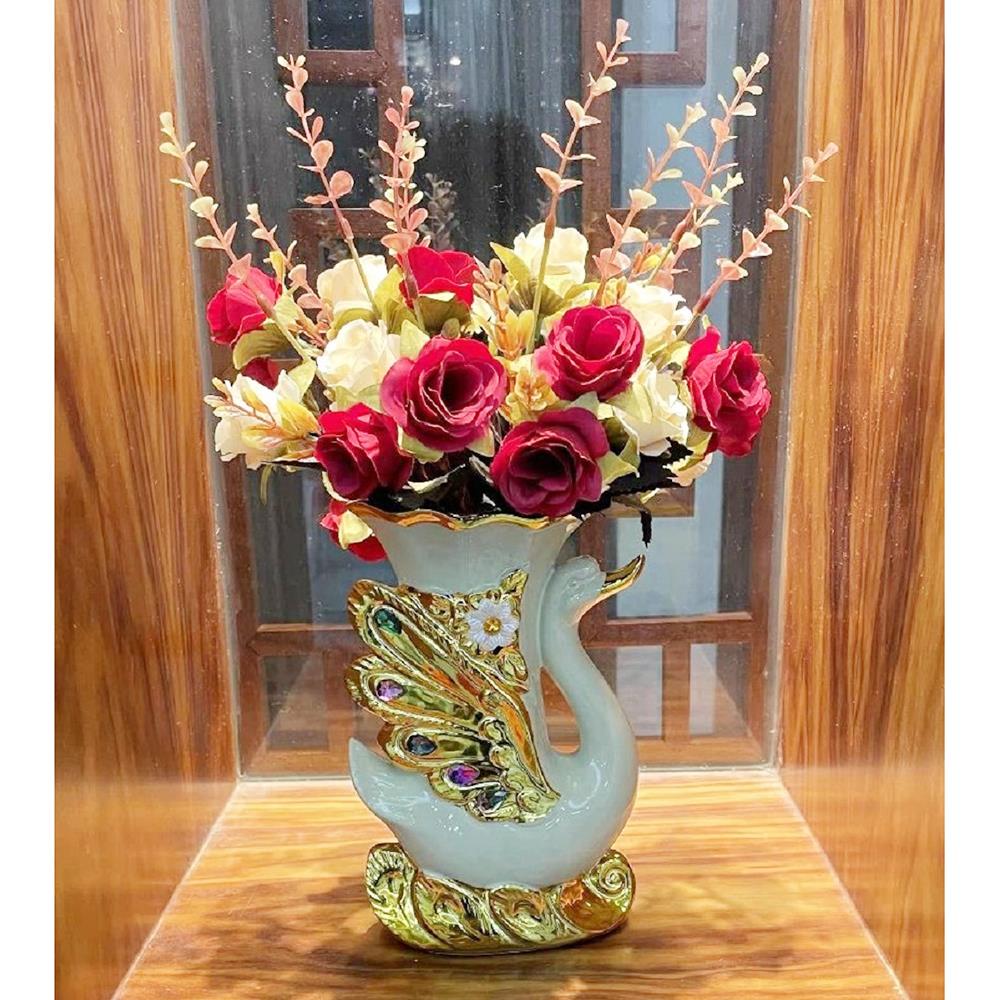 แจกันรูปทรงหงส์ สไตล์ European แต่งแต้มสีทองเพิ่มความหรูหราให้แก่พื้นที่จัดวาง ทำจากเซรามิกมีความแข็งแรง น้ำหนักและความสมดุลของแจกันช่วยใส่ดอกไม้ได้มั่นคง มาพร้อมช่อดอกกุหลาบสีสันสวยงาม สดใส แต่งเติมบรรยากาศภายในบ้านให้ดูสวยงาม เหมาะสำหรับใส่ดอกไม้เพื่อประดับตกแต่ง ตั้งโชว์ หรือมอบเป็นของขวัญให้คนพิเศษได้