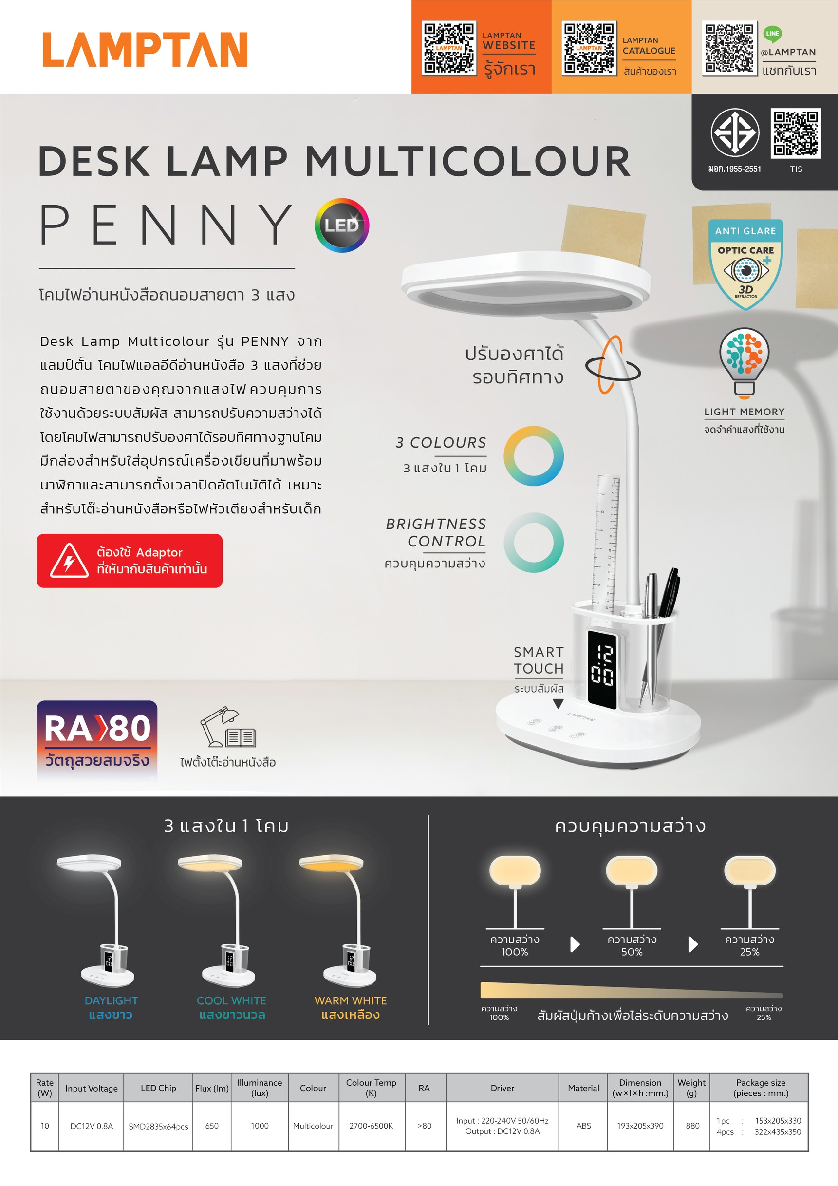 ไฟอ่านหนังสือ LED ให้กำลังไฟ 10 วัตต์ ความสว่าง 650 ลูเมน/1000 ลักซ์ เหมาะสำหรับถนอมสายตา เปลี่ยนแสงไฟได้ 3 แบบ (แสงขาว DAYLIGHT, แสงนวล COOL WHITE, แสงเหลือง WARM WHITE) หน้าโคม ANTI-GLARE ถนอมสายตา ลดแสงสะท้อนและแสงจ้าที่อาจทำให้เกิดความเมื่อยล้าสายตาได้ ควบคุมการทำงานผ่านระบบสัมผัส Smart Touch เพียงแค่แตะเบา ๆ ไม่ว่าจะปรับเปลี่ยนแสงหรือหรี่แสง ปรับความสว่างได้ 3 ระดับ เพื่อให้เหมาะกับกิจกรรมต่าง ๆ เช่น การอ่านหนังสือ พักผ่อน หรือการทำงาน มีฟังก์ชัน Light Memory ที่ช่วยให้โคมไฟจดจำค่าแสงที่ใช้งานล่าสุดไม่ต้องปรับค่าใหม่ทุกครั้งที่ใช้งาน บริเวณฐานโคมมีช่องสำหรับใส่อุปกรณ์เครื่องเขียน เช่น ปากกาหรือดินสอ ช่วยจัดระเบียบโต๊ะได้ง่ายขึ้น มาพร้อมนาฬิกาดิจิทัลตั้งเวลาปิดอัตโนมัติได้ ช่วยให้ดูเวลาได้อย่างง่ายดายขณะทำงานหรืออ่านหนังสือ สามารถปรับก้านโคมและหน้าโคมได้รอบทิศทางเพื่อให้แสงส่องไปยังทิศทางที่ต้องการได้อย่างยืดหยุ่น วัสดุโคมทำจากพลาสติก ABS คุณภาพสูง มีความแข็งแรงทนทาน มาพร้อม Adapter พร้อมเสียบใช้งาน