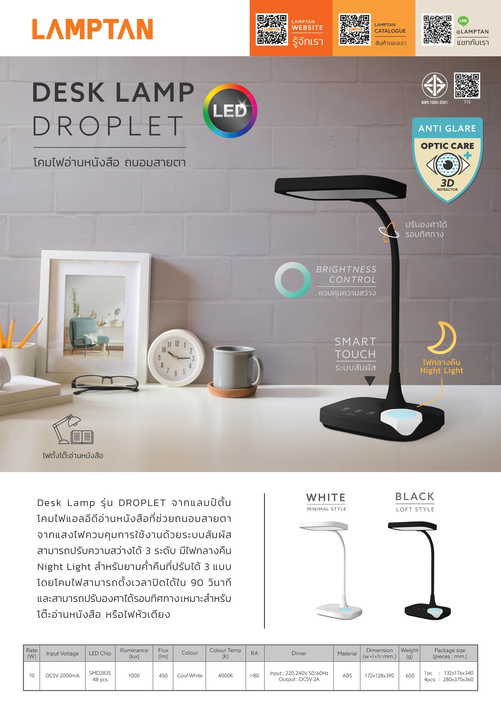 ไฟอ่านหนังสือ LED LAMPTAN DROPLET-BK 10 วัตต์ COOL WHITE สีดำเป็นมากกว่าอุปกรณ์ให้แสงสว่าง แต่เป็นเพื่อนคู่กายที่จะดูแลสายตาและเติมเต็มความสุขในทุกช่วงเวลาของคุณ ด้วยโคมไฟแอลอีดีอ่านหนังสือ รุ่น DROPLET จาก LAMPTAN สัมผัสถึงความอัจฉริยะที่แท้จริงด้วยระบบสัมผัส ที่ให้คุณเปิด-ปิด, ปรับระดับความสว่างได้ 3 ระดับ และเปลี่ยนโหมดต่าง ๆ ได้อย่างง่ายดายและราบรื่น มาพร้อมเทคโนโลยี Anti-Glare และ Optic Care ที่ช่วยลดแสงสะท้อนและแสงจ้า ทำให้แสงที่ส่องออกมานุ่มนวล สบายตา แม้จะอ่านหนังสือหรือทำงานเป็นเวลานาน