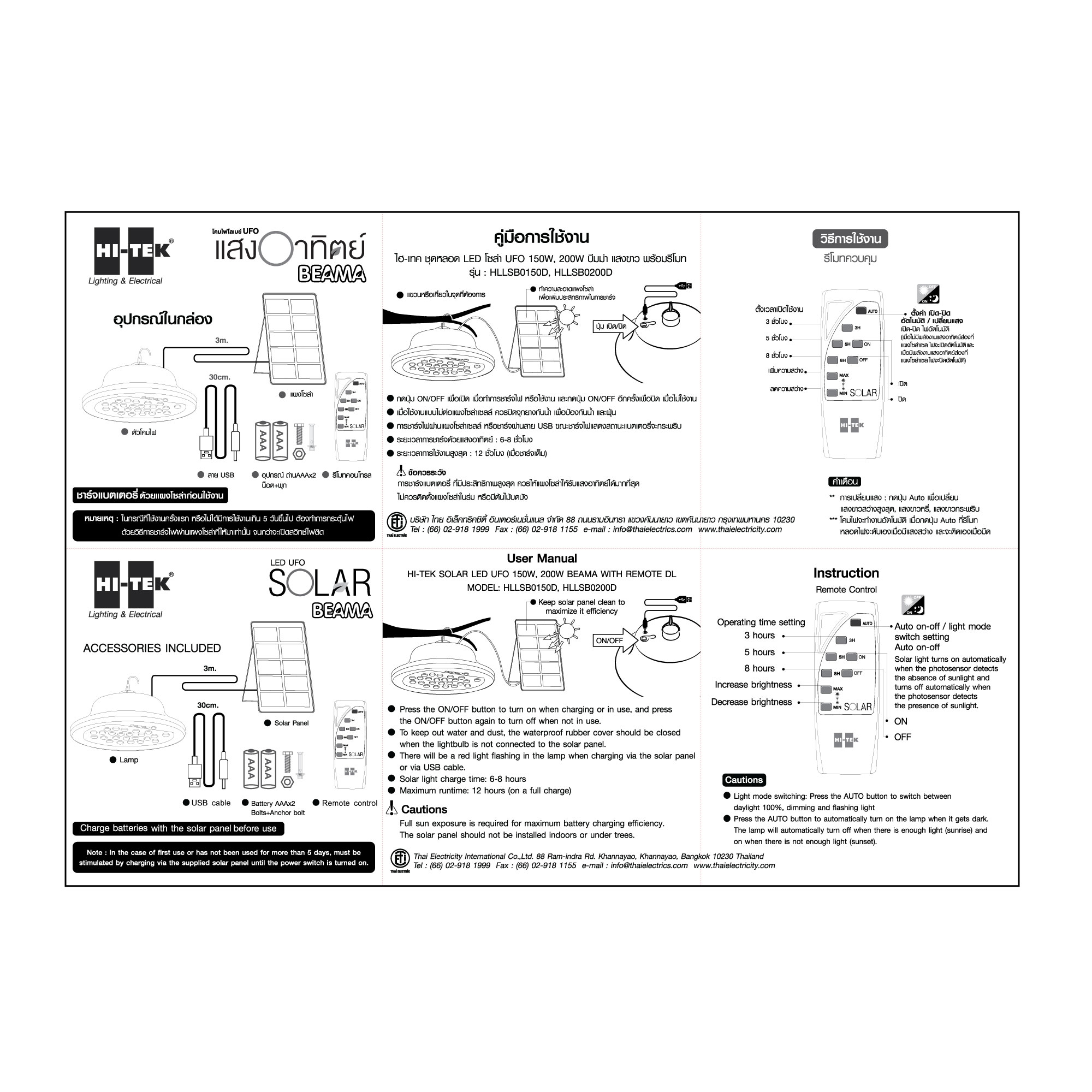 แผงโซลาร์เซลล์ Monocrystalline 5V/5W ใช้งานได้ทุกสภาพอากาศ แม้ในสภาพแสงน้อย กำลังไฟ 150 วัตต์ ค่าความสว่าง 1,550 ลูเมน สามารถกระจายแสงไฟได้กว้างทั่วทั้งบริเวณ โทนแสง DAYLIGHT แสงสีขาวสว่าง ให้ความรู้สึกเหมือนแสงธรรมชาติ มองเห็นวัตถุชัดเจน มุมกระจายแสง (Beam Angle) 120 องศา กระจายแสงวงกว้างให้แสงนุ่มนวลและไม่แยงตา ควบคุมการทำงานผ่านรีโมตคอนโทรล ไม่ว่าจะเปิด-ปิด หรี่แสง-เพิ่มแสงได้ และตั้งเวลาได้ ระบบ Light Sensor ตรวจจับแสงสว่าง และเปิด-ปิด อัตโนมัติตามแสงสว่างของดวงอาทิตย์ มาตรฐาน IP65 ป้องกันฝุ่นได้สมบูรณ์และป้องกันน้ำจากการฉีดที่อุปกรณ์ได้จากทุกทิศทาง ระบบประหยัดพลังงาน (เพียงกดสวิทซ์ปิดบนตัวโคม) ช่วยกักเก็บพลังงาน แม้ไม่ได้ใช้งาน มีสายชาร์จไฟ USB ความยาว 30 ซม. (ระยะเวลาชาร์จไฟ 6-8 ชม. สว่างนาน 11-12 ชม.) แบตเตอรี่ลิเธี่ยมไอออน 3.7V 3,000 mAh ชาร์จได้ ให้พลังงานสูง อายุการใช้งานยาวนาน
