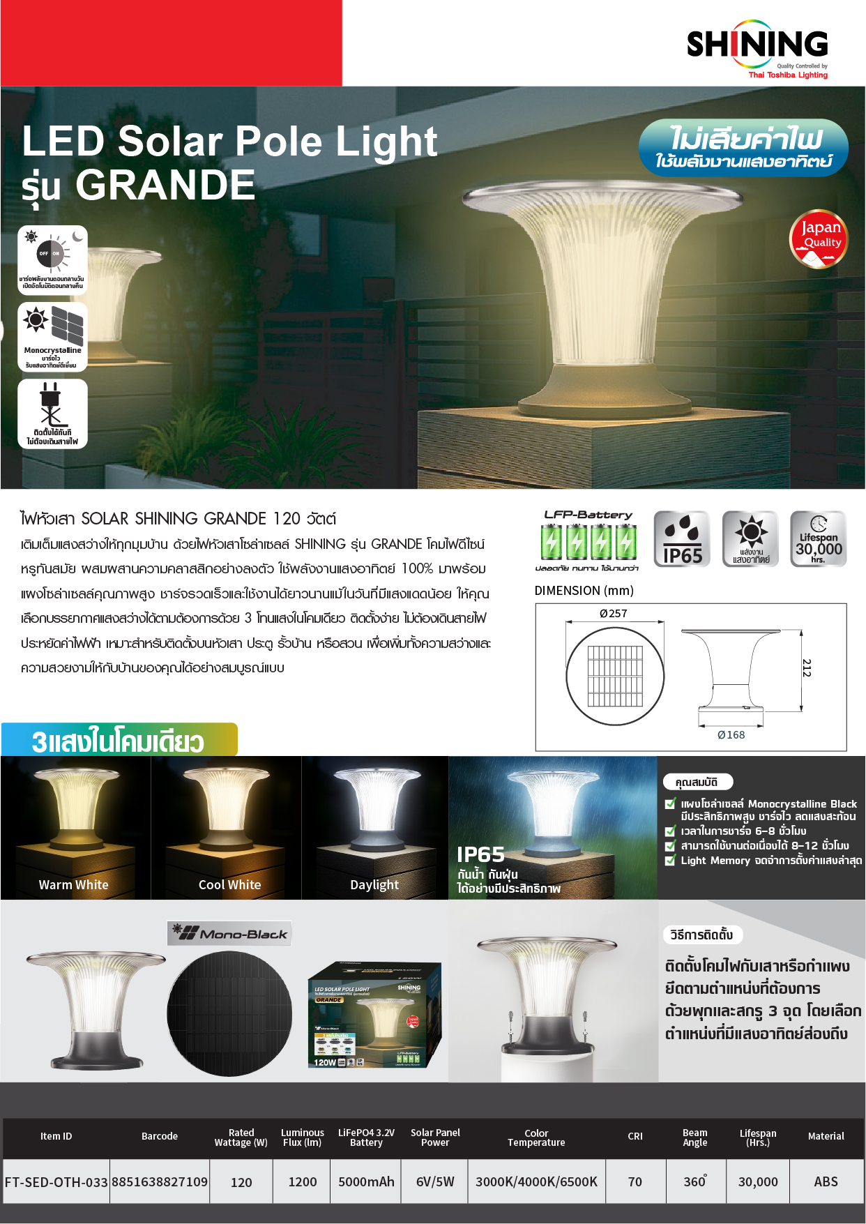 - ไฟหัวเสาโซลาร์เซลล์กำลังไฟ 120 วัตต์ ความสว่างสูงสุด 1200 ลูเมน ส่องสว่างรอบพื้นที่กว้าง