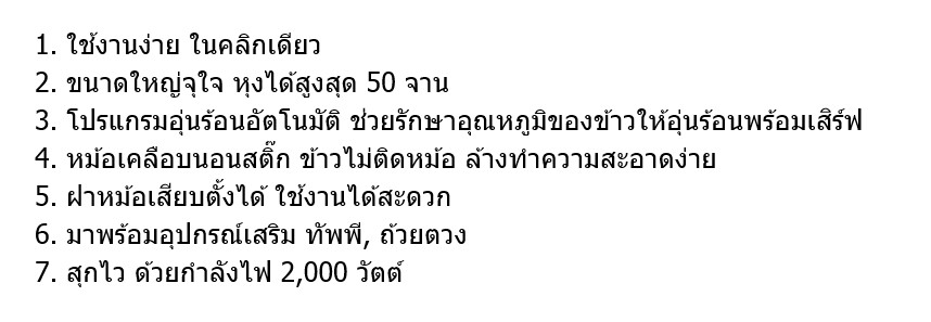 - มีโปรแกรมอุ่นร้อนอัตโนมัติ ช่วยรักษาอุณหภูมิของข้าวให้อุ่นร้อนพร้อมเสิร์ฟ