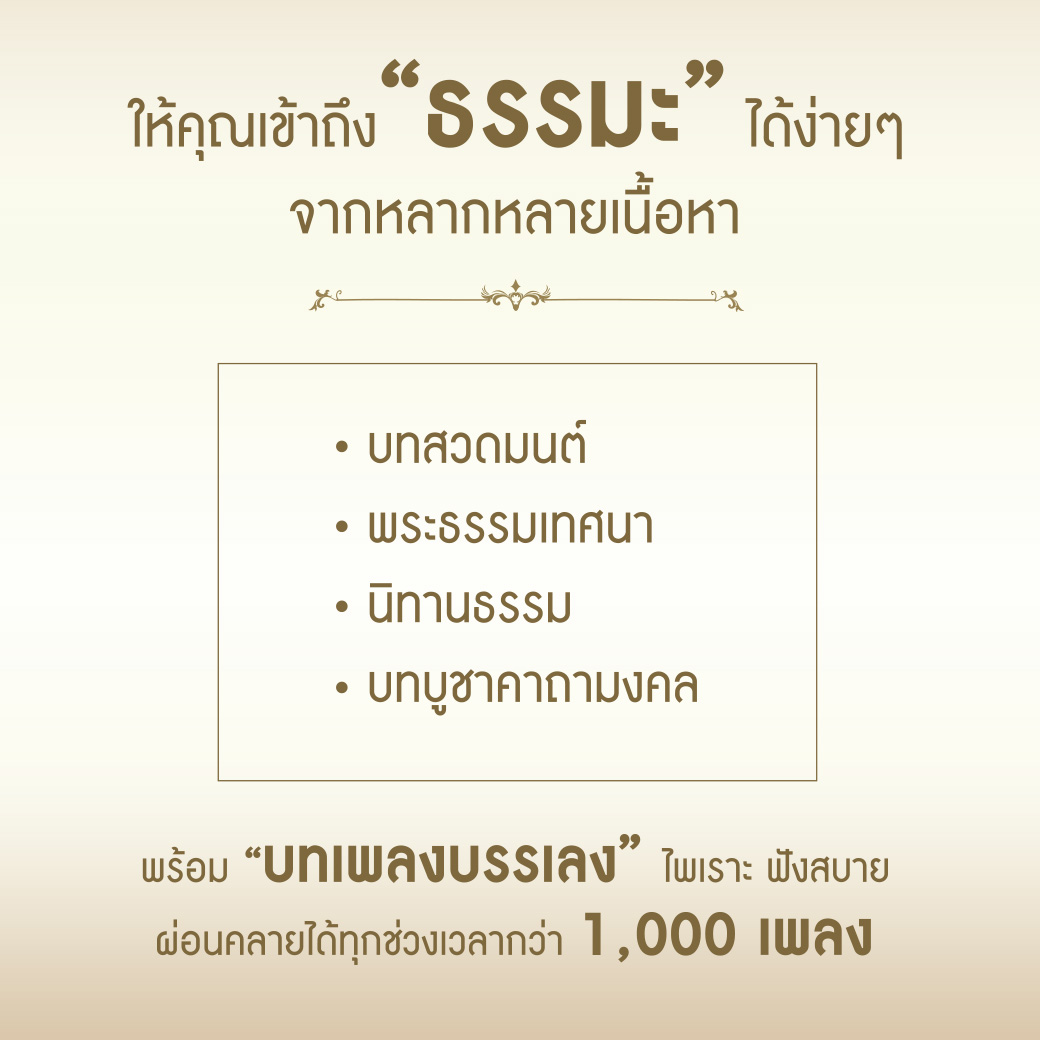 กล่องเพลงสบายธรรม GMMZ AS-GM808GMM Z Music Box กล่องเพลงสบายธรรม จิตสงบ ผ่อนคลาย สบายใจ ให้คุณเข้าถึง ธรรมะ ได้ง่ายๆ มาพร้อมหลากหลาย เนื้อหาไม่ว่าจะเป็น บทสวดมนต์ พระธรรมเทศนา นิทานธรรม บทบูชาคาถามงคล พร้อมบทเพลงบรรเลงไพเราะ ฟังสบาย กว่า 1,000 เพลง ด้วยลำโพงคุณภาพ 5 วัตต์ พร้อมจอแสดงผลแบบ LED ใช้งานง่าย อีกทั้งยังเชื่อมต่อ Bluetooth เพื่อฟังเพลง หรือพูดคุยโทรศัพท์ผ่านลำโพงได้ รองรับการฟังคลื่นวิทยุ FM ได้ และฟังได้ยาวนานต่อเนื่องสูงสุด 6 ชั่วโมง