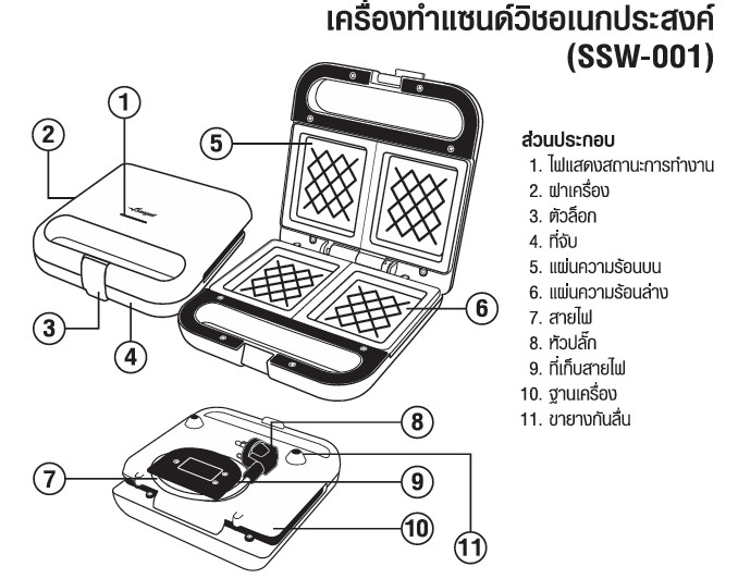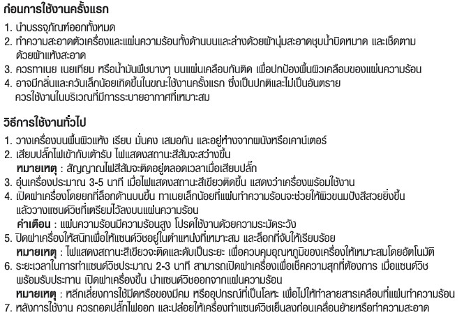 หลังจากใช้งานควรถอดปลั๊กทุกครั้ง หลังจากใช้งานทุกครั้ง ควรรอให้เครื่องทำแซนด์วิชเย็นลง แล้วจึงทำความสะอาดและจัดเก็บ ห้ามนำไปแช่หรือจุ่มในน้ำ ระวังพื้นผิวร้อน |