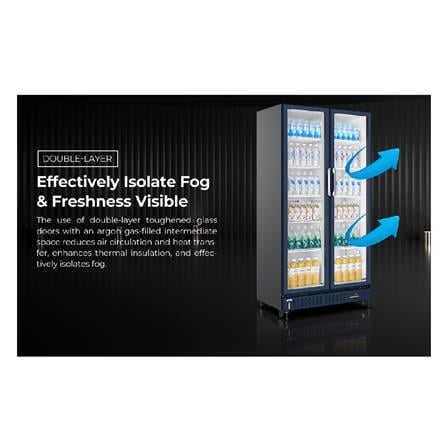 ควบคุมอุณหภูมิได้อย่างแม่นยำ ด้วย Digital Control พร้อมจอแสดงผล ใช้คอมเพรสเซอร์ขนาด 1/2 HP และสารทำความเย็น R290 ช่วยประหยัดพลังงาน ประตูกระจก Low E 2 ชั้น ช่วยรักษาอุณหภูมิภายใน และป้องกันรังสีความร้อนจากภายนอก มีระบบ No Frost Technology ช่วยป้องกันน้ำแข็งเกาะ มีไฟ LED ภายในช่วยให้มองเห็นสินค้า และหยิบง่าย ชั้นวางสินค้าภายในมากถึง 12 ชั้น ปรับเปลี่ยนการใช้งานได้ง่าย จัดเก็บได้จุใจ มาพร้อมล้อขนาดใหญ่และ stopper ป้องกันการเคลื่อนที่ ความดังของเสียงเพียง 63 เดซิเบล
