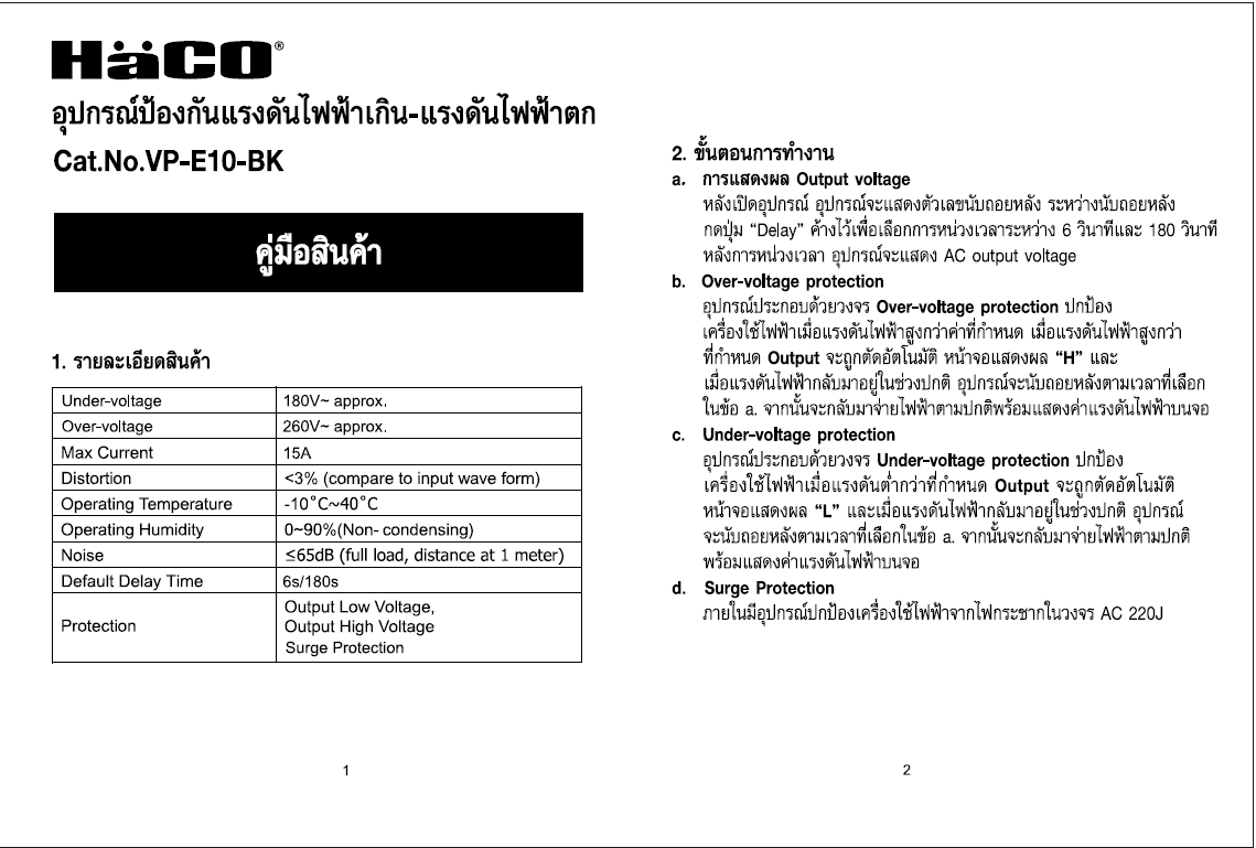 - ตัดไฟอัตโนมัติเมื่อแรงดันไฟฟ้าต่ำกว่า 180V หรือสูงกว่า 260V เพื่อป้องกันความเสียหายต่อเครื่องใช้ไฟฟ้า