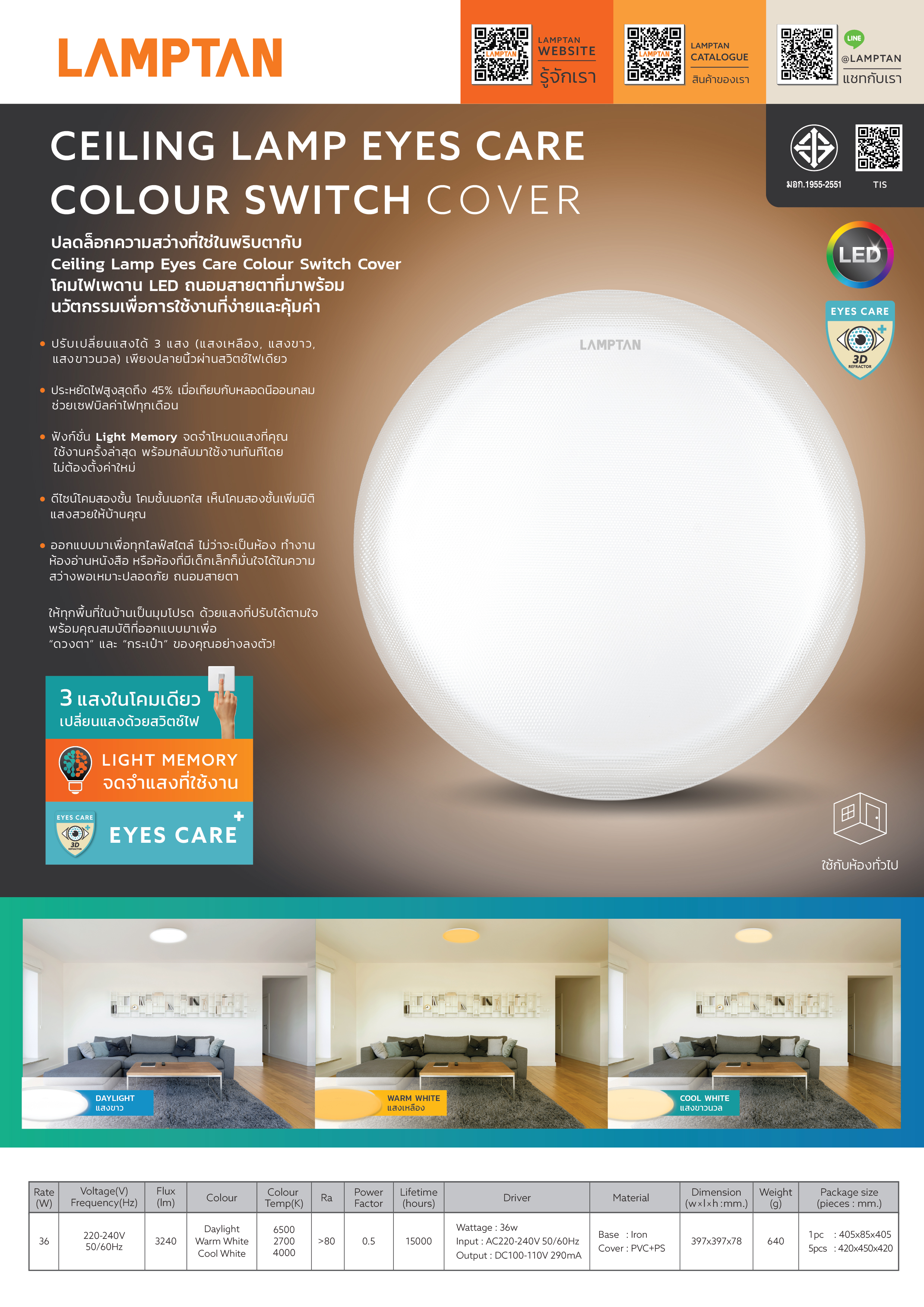 ไฟเพดาน LED LAMPTAN COVER 16 นิ้ว 36 วัตต์ DAYLIGHT/COOL WHITE/WARM WHITE สีขาวปลดล็อกความสว่างที่ใช่ในพริบตา ด้วยโคมไฟเพดาน LED EYES CARE COLOUR SWITCH COVER จาก LAMPTAN ให้ทุกพื้นที่ในบ้านเป็นมุมโปรด ด้วยแสงที่ปรับได้ตามใจผ่านสวิตช์ไฟ มาพร้อมนวัตกรรมที่ออกแบบมาเพื่อการใช้งานที่ง่ายและคุ้มค่า ประหยัดไฟสูงสุดถึง 45% เมื่อเทียบกับหลอกนีออนกลม ช่วยเซฟบิลค่าไฟทุกเดือน ไม่ว่าจะเป็นห้องทำงาน, ห้องอ่านหนังสือ หรือห้องที่มีเด็กเล็ก ก็มั่นใจได้ในความสว่างพอเหมาะ
