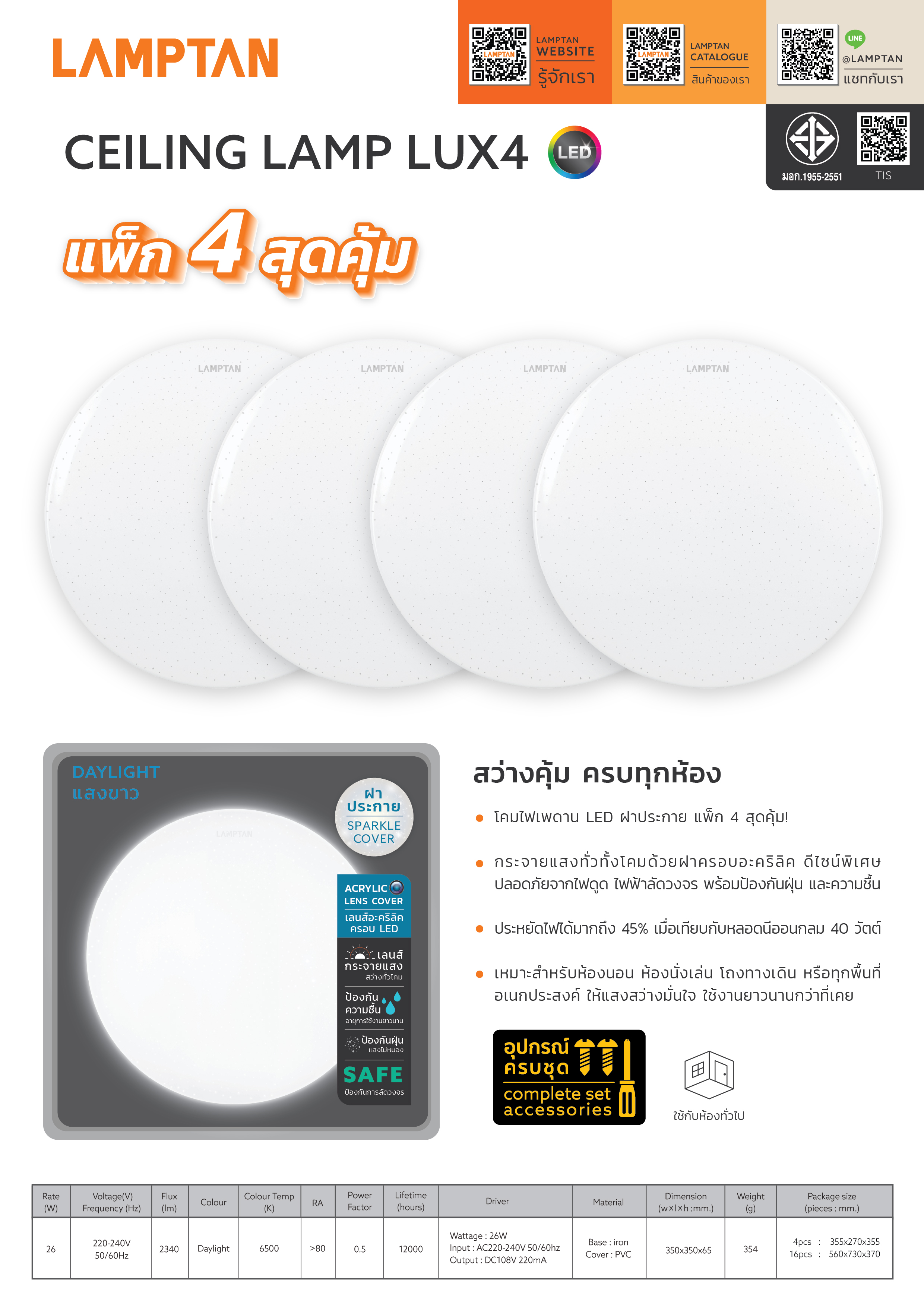 ไฟเพดาน LED LAMPTAN LUX4 14 นิ้ว 26 วัตต์ DAYLIGHT สีขาว (แพ็ก 4 ชิ้น)เปลี่ยนบรรยากาศบ้านคุณให้สว่างสดใส ด้วยโคมไฟเพดาน LED แพ็ก 4 ชิ้น จาก LAMPTAN ภายในใช้เลนส์อะคริลิคครอบหลอด LED ที่ล้ำสมัย ช่วยกระจายแสงให้เต็มโคม สว่างสม่ำเสมอทั่วทั้งห้อง แสงนุ่มนวลสบายตา ไม่เป็นจุดแสงจ้า มาพร้อมฝาครอบดีไซน์พิเศษ ให้แสงที่ส่องออกมามีมิติ ระยิบระยับ สวยงามดุจดวงดาว เพิ่มความหรูหราทันสมัยให้กับห้องของคุณทันที ประหยัดไฟได้มากถึง 45% เมื่อเทียบกับหลอดนีออนกลม 40 วัตต์ เหมาะสำหรับห้องนอน ห้องนั่งเล่น ทางเดิน หรือทุกพื้นที่ที่ต้องการแสงสว่างที่ทั้งสวยงาม มีคุณภาพ และประหยัด