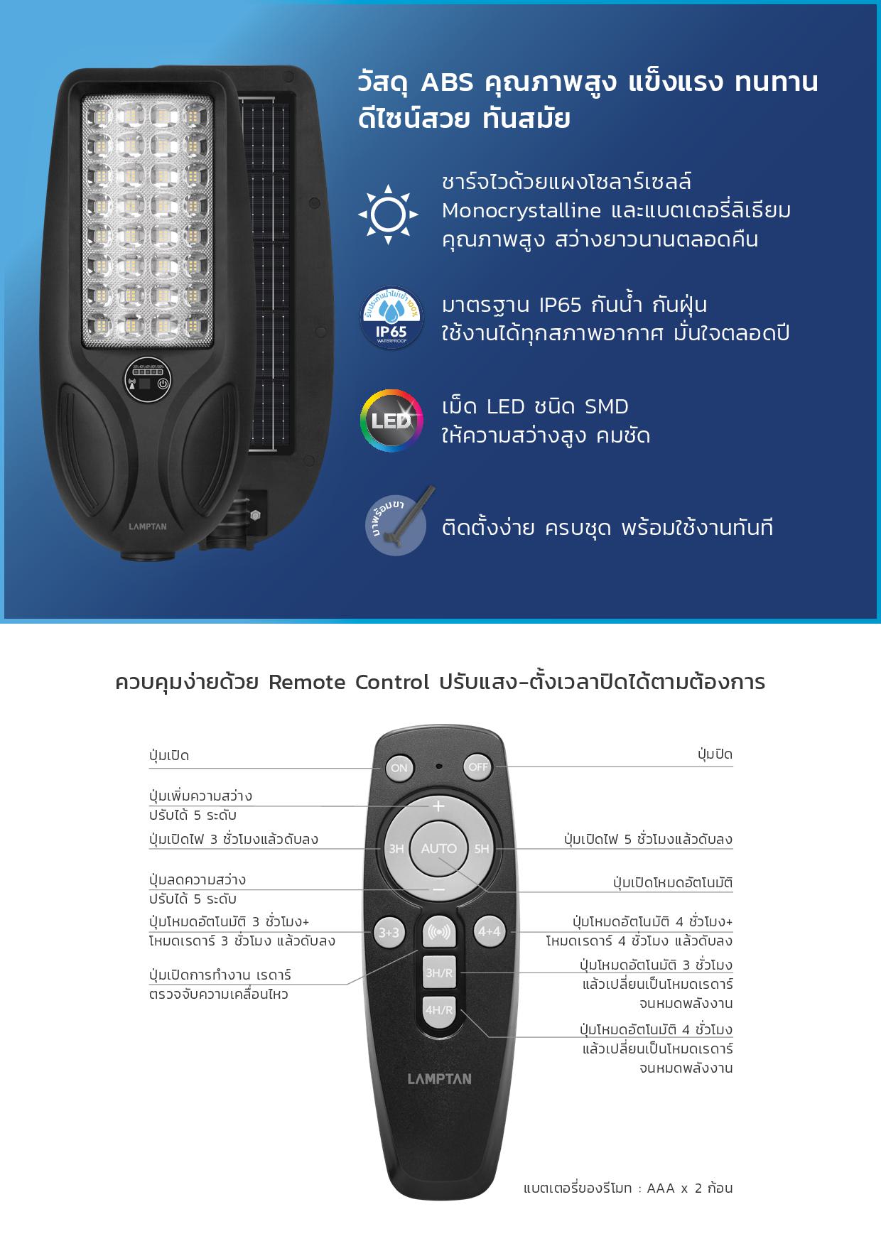 แผงโซลาร์เซลล์ชนิด Monocrystalline มีประสิทธิภาพในการใช้งาน และทนทานต่อสภาพอากาศได้ สปอทไลท์ SOLAR กำลังไฟ 450 วัตต์ ความสว่าง 5,000 ลูเมน กระจายแสงสว่างได้กว้างทั่วบริเวณ มาพร้อมแสงโทน DAYLIGHT แสงขาวสบายตาเหมือนแสงธรรมชาติ ช่วยให้มองเห็นได้อย่างชัดเจน ออกแบบและดีไซน์หน้าโคมเป็นทรงโค้งมน ช่วยเพิ่มมุมกระจายแสงไฟ ให้พื้นที่สว่างได้อย่างทั่วถึง ควบคุมการทำงานผ่านรีโมตคอนโทรล ทั้งการเปิด-ปิด, ปรับแสงสว่าง และตั้งเวลาเปิดจากระยะไกล มีระบบ Light Sensor ตรวจจับแสงสว่างที่จะปิดเองในเวลากลางวัน และจะเปิดเองในเวลากลางคืน เซนเซอร์ตรวจจับความเคลื่อนไหว ในระยะ 8-10 เมตร โคมจะเพิ่มความสว่างจาก 10% เป็น 100% รับรองมาตรฐาน IP65 กันฝุ่น และกันน้ำได้อย่างมีประสิทธิภาพ เหมาะสำหรับใช้งานภายนอกอาคาร ตัวโคมทำจากพลาสติก ABS เกรดคุณภาพ มีความแข็งแรง สามารถทนต่อความร้อนจากแสงไฟได้ดี มีโหมด Battery Lock Mode โคมไฟจะอยู่ในสถานะล็อกเพื่อป้องกันการใช้แบตเตอรี่ก่อนการใช้งาน