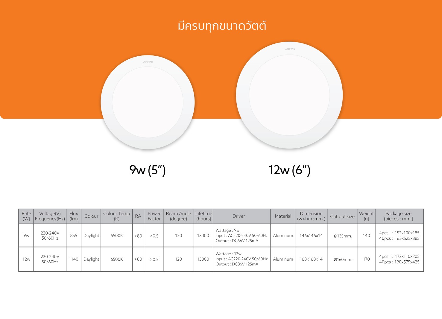 ดาวน์ไลท์ LED ขนาดเส้นผ่าศูนย์กลาง 6.6 นิ้ว กำลังไฟ 12 วัตต์ ค่าความสว่าง 1,140 ลูเมน โทนแสง DAYLIGHT แสงสีขาวที่เหมือนแสงธรรมชาติ มองเห็นได้ชัดเจน สบายตาไม่กะพริบ ใช้กับแรงดันไฟฟ้า 220-240 โวลต์, 50/60 เฮิรตซ์ และมีอายุการใช้งานนาน 13,000 ชั่วโมง มีไดเวอร์แยก ช่วยปรับสมดุลของกระแสไฟ ช่วยระบายความร้อนเพื่อการใช้งานที่ยาวนานขึ้น ค่าดัชนีวัดค่าความถูกต้องของสีจากการส่องสว่างของหลอดไฟเมื่อตกลงบนวัตถุ (RA) >80 ไม่มีสารปรอทและไม่มีรังสี UV ที่เป็นอันตราย ปลอดภัยต่อผิวหนังและเป็นมิตรต่อสิ่งแวดล้อม โคมผลิตจากอะลูมิเนียม ดีไซน์สวยเรียบบางพิเศษ ช่วยตกแต่งฝ้าเพดานให้ดูโปร่งสะอาดตา ช่วยให้ประหยัดไฟได้มากถึง 85% เมื่อเทียบกับดาวน์ไลท์แบบเก่าช่วยลดค่าไฟในระยะยาว