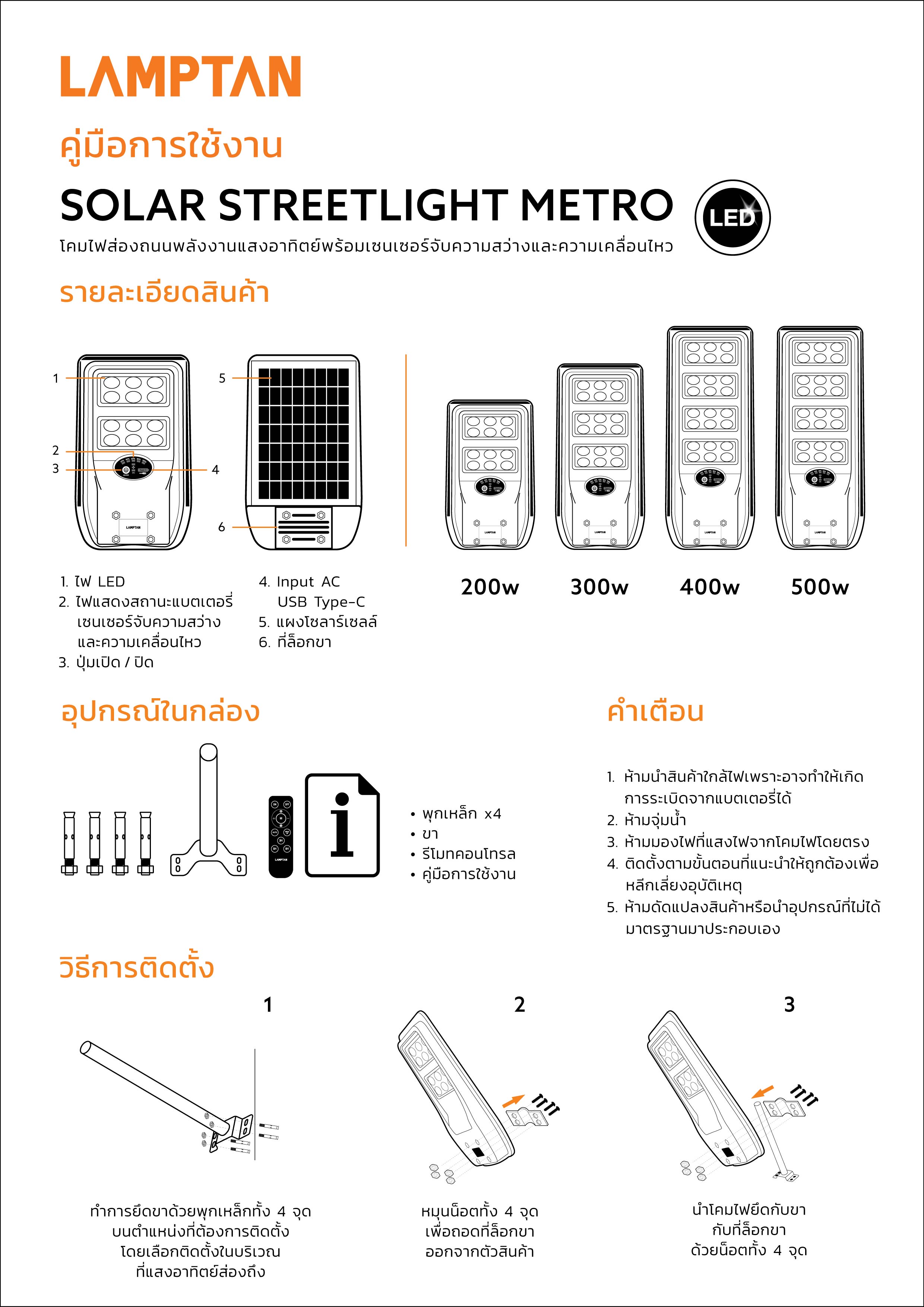 ไฟถนน SOLAR LAMPTAN METRO 200 วัตต์ DAYLIGHT สีดำให้แสงสว่างตลอดทางเดิน ด้วยไฟถนนโซลาร์เซลล์ จากแบรนด์ LAMPTAN มีเซนเซอร์จับความสว่างโดยโคมไฟจะปิดเองอัตโนมัติในตอนกลางวัน และจะทำการชาร์จไฟด้วยโซลาร์เซลล์ Monocrystanlline คุณภาพสูงลงแบตเตอรี่ลิเธียม เมื่อถึงเวลากลางคืนโคมไฟจะสว่างอัตโนมัติ มาพร้อมเซนเซอร์ตรวจจับความเคลื่อนไหวที่ระยะ 6-8 เมตร ไฟจะให้แสงสว่าง 100% เป็นเวลา 30 วินาที หลังจากไม่พบความเคลื่อนไหว โคมไฟจะปรับระดับความสว่างกลับมาที่ 20% เพื่อสำรองพลังงานไว้ให้คุณใช้งานได้ยาวนานตลอดคืน