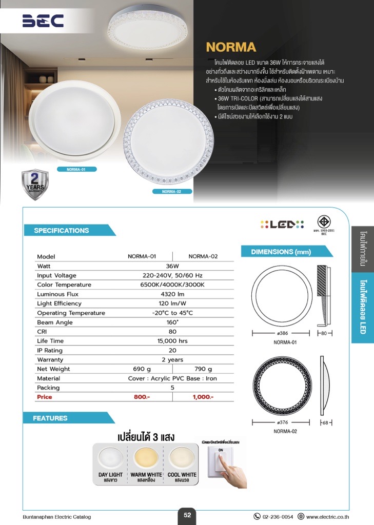 ไฟเพดาน LED BEC NORMA-01 15 นิ้ว 36 วัตต์ DAYLIGHT/COOL WHITE/WARM WHITE สีขาว