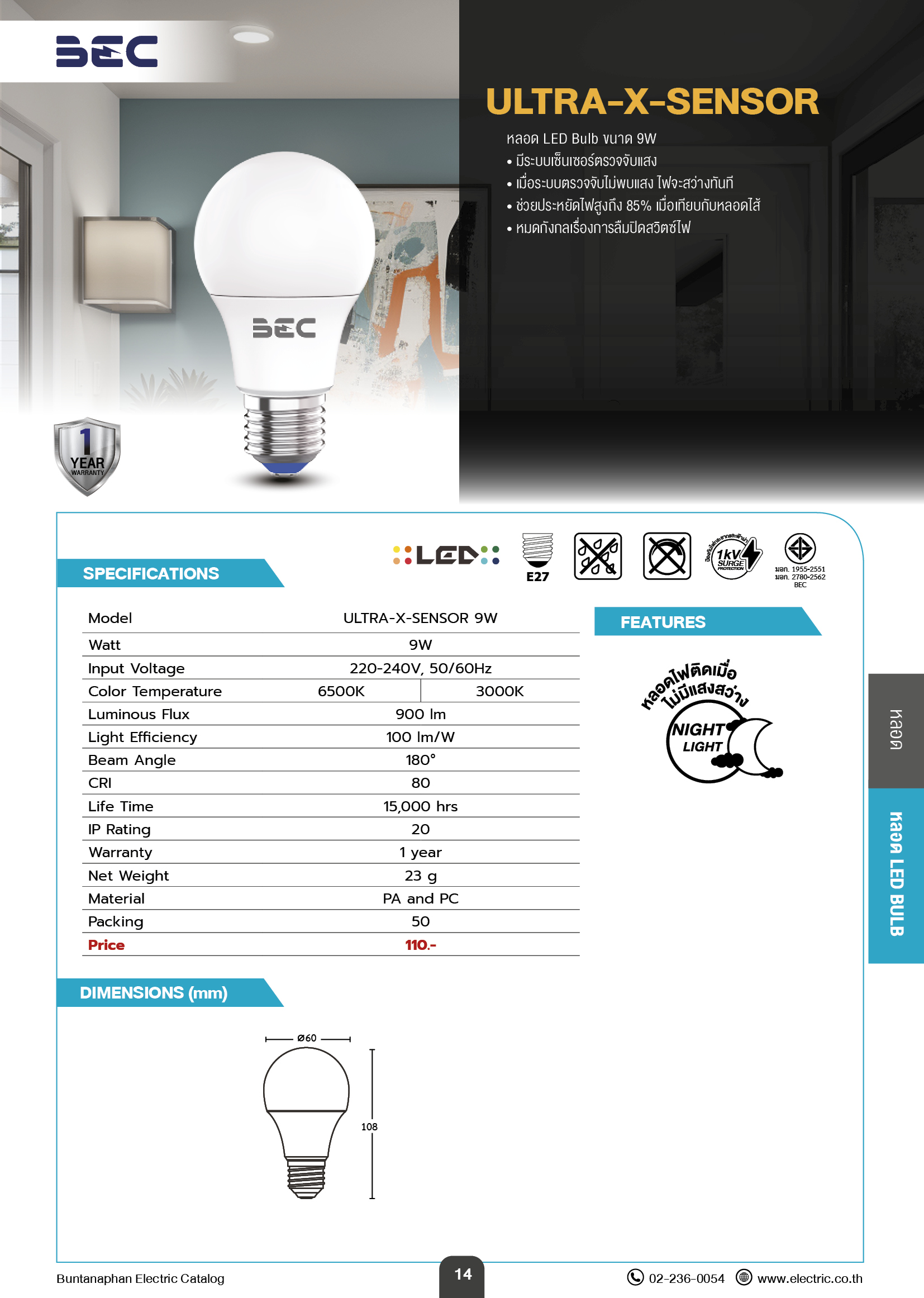 หลอด LED BEC ULTRA-X- LIGHT SENSOR 9 วัตต์ DAYLIGHT E27