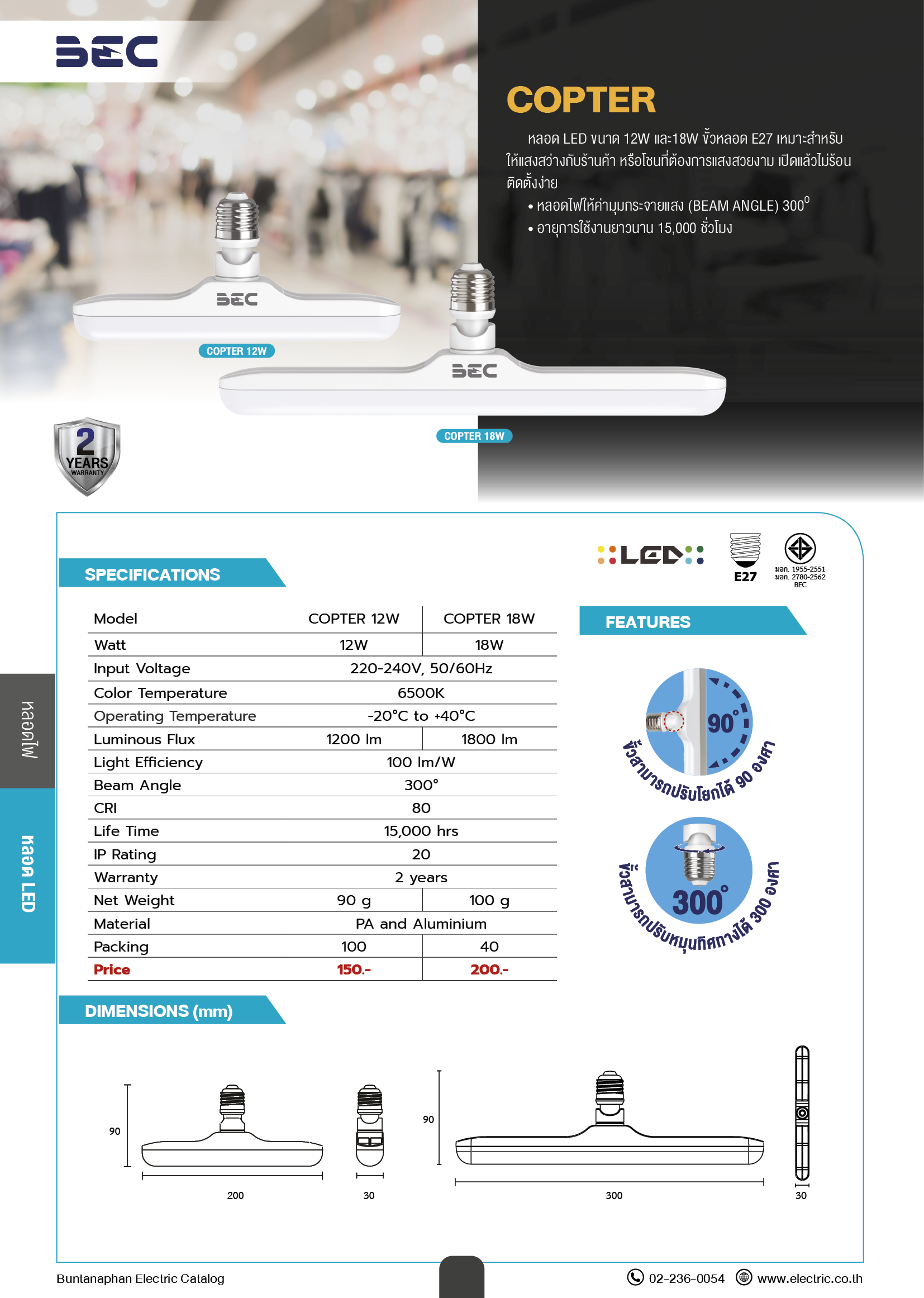 หลอด LED BEC COPTER 12 วัตต์ DAYLIGHT E27เปลี่ยนพื้นที่ของคุณให้สว่างอย่างมีประสิทธิภาพและประหยัดอย่างชาญฉลาด ด้วยหลอดไฟ COPTER จากแบรนด์ BEC เทคโนโลยี LED ทำให้กินไฟน้อยเพียง 12 วัตต์ แต่ให้ความสว่างที่เทียบเท่าหลอดไฟแบบเดิมที่มีกำลังวัตต์สูงกว่ามาก ช่วยลดค่าไฟฟ้าได้อย่างชัดเจน ตัวช่วยสำคัญที่ตกแต่งสถานที่ ร้านค้า สร้างบรรยากาศให้มีมิติ มาพร้อมกับโทนแสงสีขาวสดใส เปิดแล้วไม่ร้อน ติดตั้งง่าย อีกทั้งยังมีความปลอดภัยในการใช้งานสูงด้วยวัสดุที่ผ่านกระบวนการผลิตที่ได้มาตรฐาน&