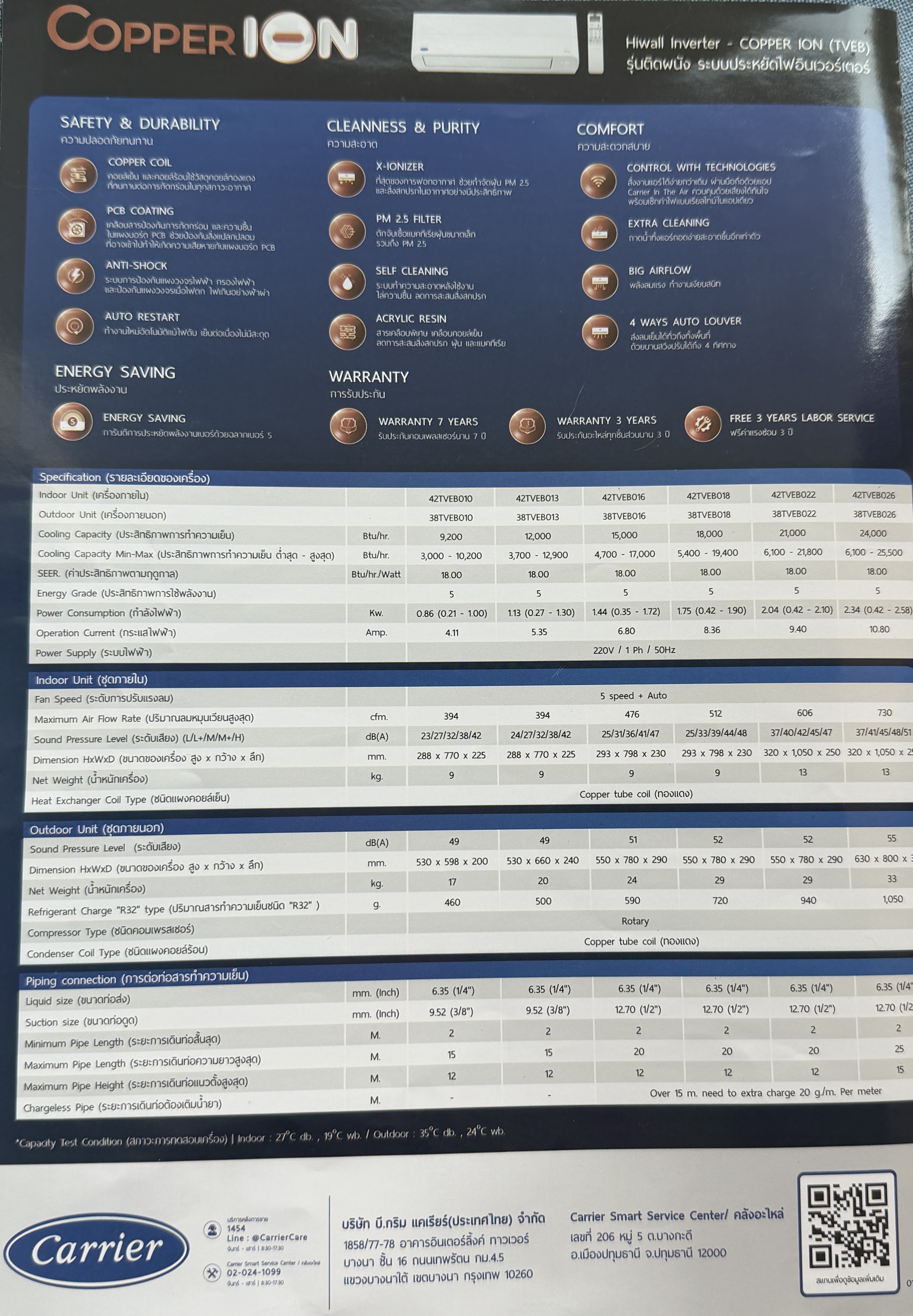 แอร์ผนัง CARRIER 42TVEB018/38TVEB018 18000 บีทียู อินเวอร์เตอร์สัมผัสอากาศเย็นสบายเพียงปลายนิ้วสัมผัส ด้วยแอร์ผนังจาก CARRIER ด้วยการทำงานของคอมเพรสเซอร์อินเวอร์เตอร์ที่มอบความเย็นต่อเนื่องแบบไม่มีสะดุด พร้อมทำงานเงียบและประหยัดพลังงานมากขึ้น อีกทั้งยังมีแผ่นกรอง PM2.5 ที่ช่วยดักจับฝุ่นละอองขนาดเล็กได้อย่างมีประสิทธิภาพ นอกจากนี้ยังมีระบบทำความสะอาดตัวเองเพื่อลดแบคทีเรียและเชื้อรามอบอากาศบริสุทธิ์สดชื่นให้คุณและทุกคนในครอบครัวได้ตลอดเวลา อีกทั้งยังมาพร้อมคอยล์ทองแดงที่ทนทานต่อความร้อนและทุกสภาวะอากาศ เสริมความทนทานอีกระดับด้วยระบบป้องกันความเสียหายของแผงวงจรไฟฟ้าเมื่อเกิดเหตุไฟตกหรือฟ้าฝ่า เพื่อให้เครื่องปรับอากาศทำงานได้อย่างราบรื่น ตอบโจทย์ความสะดวกสบายด้วยเทคโนโลยีการเชื่อมต่อแบบไร้สายที่ให้คุณสามารถควบคุมและสั่งการผ่านแอปพลิเคชันในมือคุณได้ง่าย ๆ