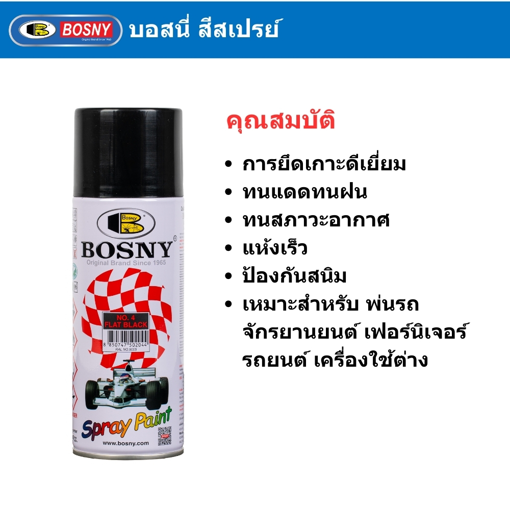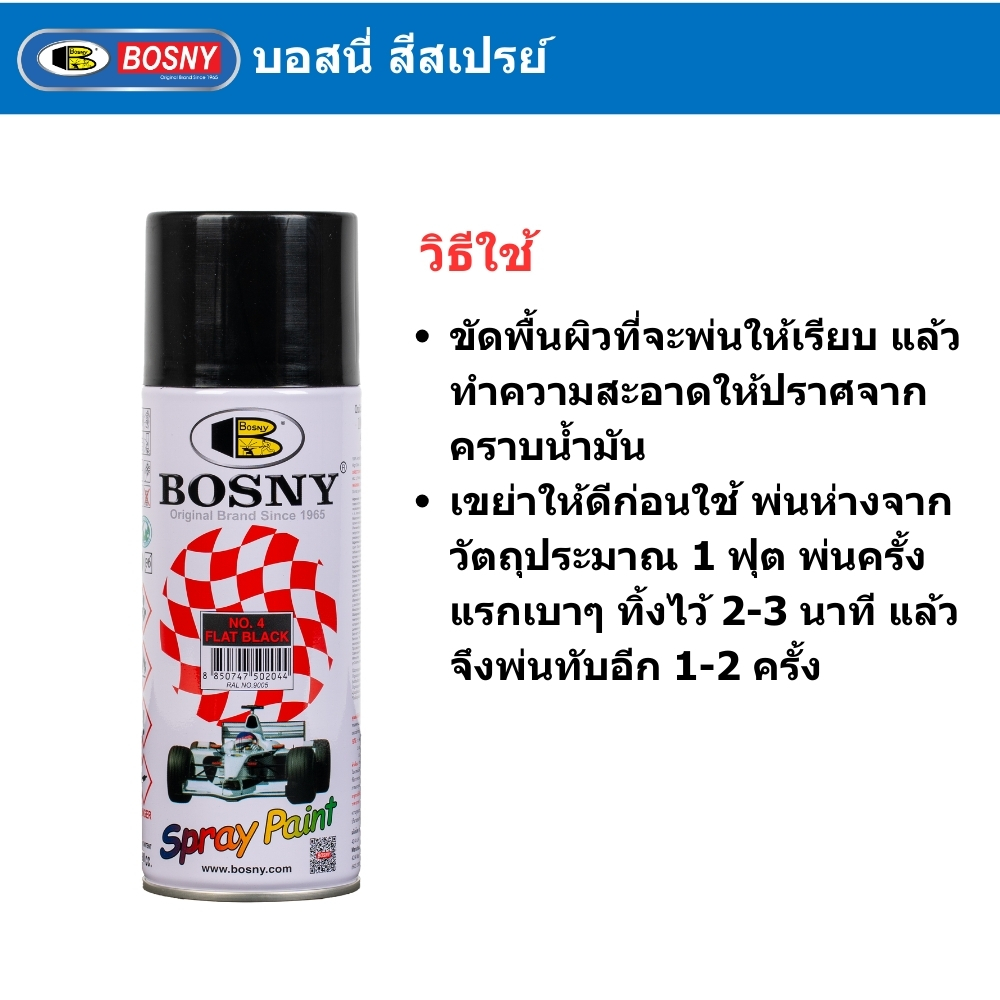 สีสเปรย์ BOSNY 4 สีดำด้าน 400 ซีซีเปลี่ยนงานพ่นสีให้เป็นเรื่องง่ายและรวดเร็วยิ่งขึ้น ด้วยสีสเปรย์ จากแบรนด์ BOSNY ที่ถูกออกแบบมาเพื่อความทนทานและการใช้งานที่หลากหลาย คุณสมบัติเด่นของเนื้อสีที่ติดทนนาน ไม่หลุดร่อน และไม่เปราะแตกง่าย ช่วยรักษาความสวยงามของชิ้นงานให้ดูใหม่อยู่เสมอในทุกสภาพแวดล้อม ตัวสียังมีประสิทธิภาพในการช่วยป้องกันสนิมให้กับวัสดุโลหะ ช่วยยืดอายุการใช้งานให้กับรถยนต์หรืออุปกรณ์งานช่างของคุณ