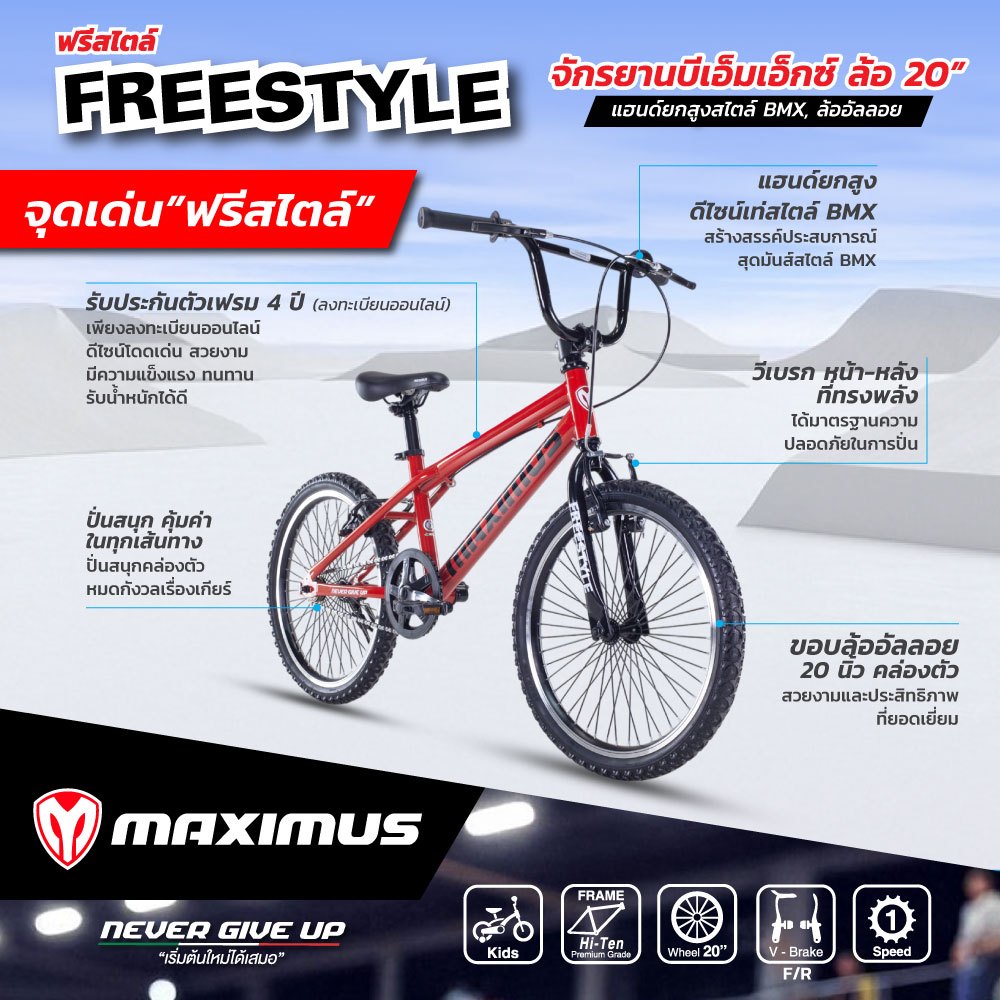 จักรยานวิบาก MAXIMUS รุ่น FREESTYLE สีเขียว/ดำ ล้อ 20นิ้วโฉมใหม่!! Maximus จักรยานเด็ก ล้อ 20 นิ้ว รุ่น FREESTYLE (ฟรีสไตล์) ทรง BMX มาในคอนเซปต์โยกย้ายร่างกาย ได้อย่างอิสระ ให้น้องๆ ปั่นสนุก คล่องตัว ปั่นออกกำลังกาย เพิ่มความคิดสร้างสรรค์ ให้กับวัยซ่า!! MAXIMUS รุ่น #FreeStyle 20 นิ้ว จักรยาน BMX ที่มาพร้อมกับดีไซน์โฉมใหม่ และฟังก์ชั่นการขับขี่ และความปลอดภัยอย่างจัดเต็ม ✅ หลักอานปรับสูง - ต่ำได้ ให้เหมาะสมกับอายุและส่วนสูงของน้องๆ เหมาะสำหรับน้องๆ อายุ 5 ขวบขึ้นไป ความสูงตั้งแต่ 115 เซนติเมตร ✅ ล้อ 20 นิ้วให้น้องๆ ปั่นสนุก คล่องตัว และปลอดภัยด้วยซี่ลวดหนา 14G และถี่ถึง 28 เส้น ✅ เฟรมผลิตจากเหล็กไฮเทนสตีลคุณภาพสูง แข็งแรง ทนทาน และใช้การทำสีแบบพิเศษให้ได้สีที่โดเด่น และสวยสะดุดตา ✅ แฮนด์สไตล์ BMX ยกสูง ให้น้องๆ สนุกสนานในการปั่นสไตล์ BMX ข้อมูลของจักรยานเด็กฟรีสไตล์ เฟรม : เหล็กไฮเทนสตีลคุณภาพสูง แข็งแรง ทนทาน และใช้การทำสีแบบพิเศษให้ได้สีที่โดเด่น และสวยสะดุดตา หลักอาน : ปรับสูง - ต่ำได้ ให้เหมาะสมกับอายุและส่วนสูงของน้องๆ เหมาะสำหรับน้องๆ อายุ 5 ขวบขึ้นไป ความสูงตั้งแต่ 115 เซนติเมตร เกียร์ : ซิงเกิลสปีด ดูแลรักษาง่าย และมีประสิทธิภาพ ล้อ : ล้อ 20 นิ้ว ให้น้องๆ ปั่นสนุก คล่องตัว และปลอดภัยด้วยซี่ลวดหนาและถี่ถึง 28 เส้น ยางใน : 20x2.35 นิ้ว เบรก : ระบบวีเบรก หน้า - หลัง ควบคุมอิสระ ใช้งานง่ายและทรงพลัง มาตรฐานความปลอดภัย อุปกรณ์เสริม : ขาตั้ง มีให้เลือก 4 สี พร้อมมั่นใจในคุณภาพ ด้วยการรับประกันตัวเฟรม 3 ปี และรับประกันเพิ่มเป็น 4 ปี เมื่อลงทะเบียนการรับประกัน **ทางร้านจัดส่งสินค้าเป็นกล่องพร้อมคู่มือการประกอบ** ประกอบลงกล่อง 85% ลูกค้าประกอบเอง 15% (แฮนด์ ล้อหน้า เบาะ บันได) ** 1 คัน ต่อ 1 คำสั่งซื้อ ใช้เวลาจัดส่งประมาณ 2-3 วันทำการ **งดเปลี่ยนแปลง ชื่อ-ที่อยู่/เบอร์โทร/สี-ขนาด ของสินค้า ภายหลังจากสั่งสินค้า ทุกกรณี