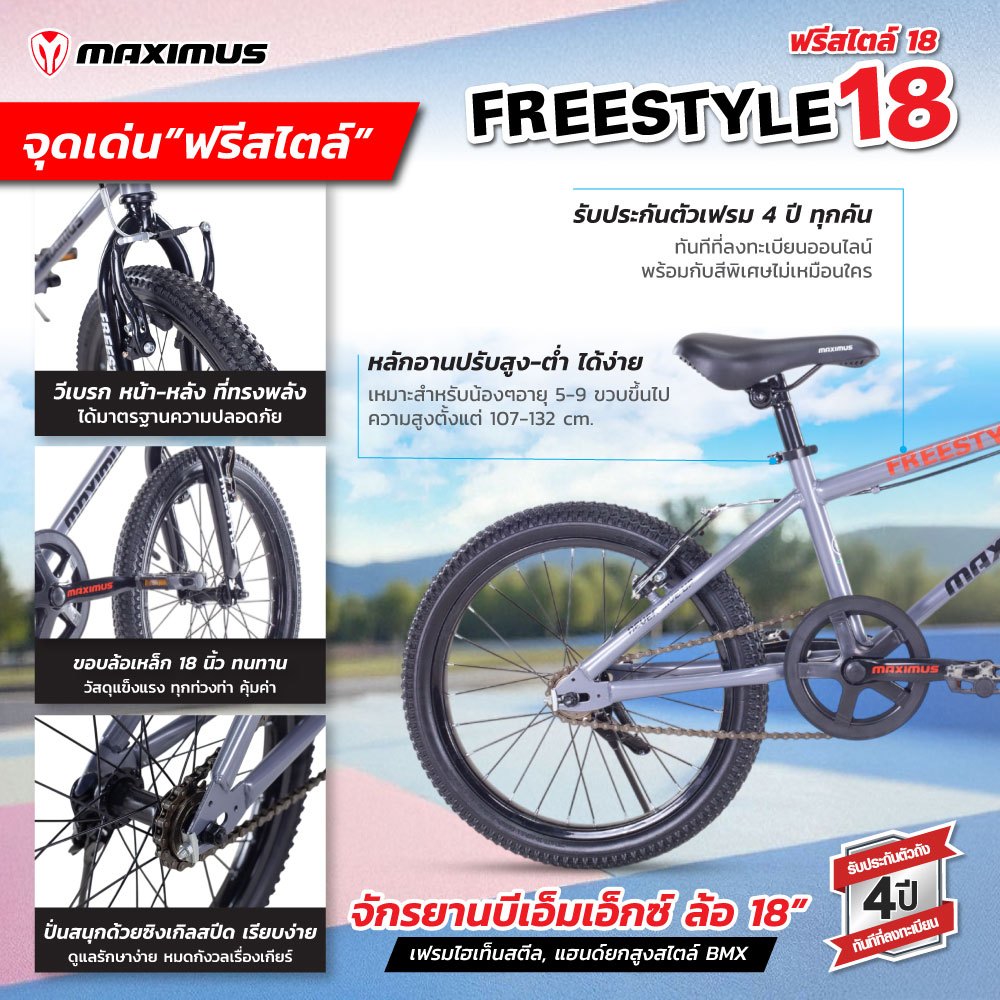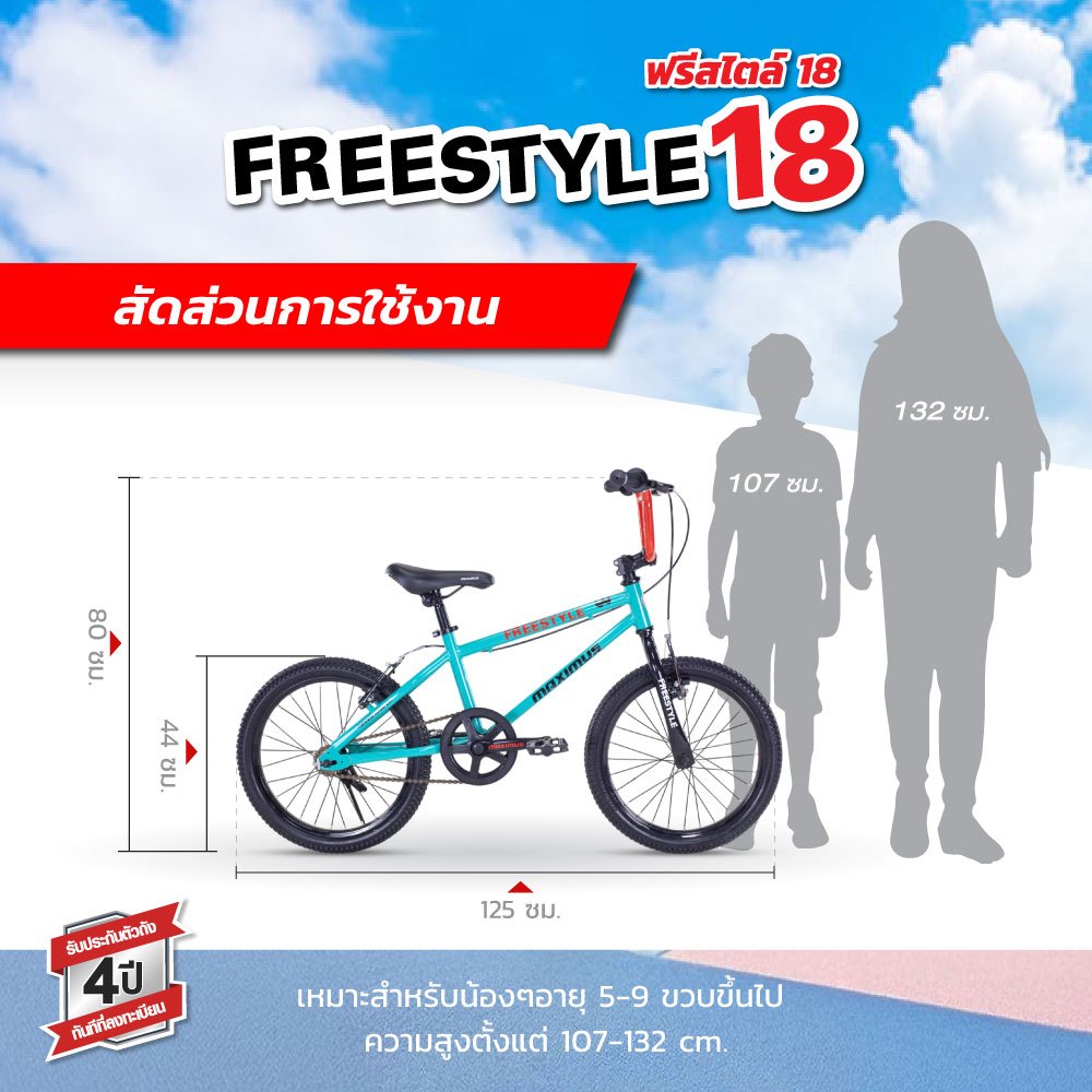 จักรยานวิบาก MAXIMUS รุ่น FREESTYLE สีเขียว ล้อ 18นิ้วจักรยาน BMX แบรนด์ MAXIMUS รุ่น FREESTYLE 18 สำหรับเด็กที่มีส่วนสูงตั้งแต่ 120 ซม. ขึ้นไป รายละเอียดตัวรถ - ตัวเฟรมผลิตจาก HI-TEN STEEL คุณภาพสูง แข็งแรง ทนทาน พร้อมลุยได้ทุกสภาพถนน - แฮนด์ BMX สนุกสนานในการปั่นสไตล์ BMX - ขอบล้อ 18" ปั่นสนุกคล่องตัว โดดเด่นด้วยซี่ลวดซี่แดงสองเส้น - ระบบ V-Brake หน้า-หลัง ควบคุมอิสระ แยกหน้า-หลัง - เหมาะสำหรับน้องๆ ที่มีความสูงตั้งแต่ 120 cm. ขึ้นไป ( อายุประมาณ 5 ขวบ ขึ้นไป ) - รับประกัน : ตัวเฟรมนาน 3 ปี ไม่รวมอะไหล่สึกหรอ .